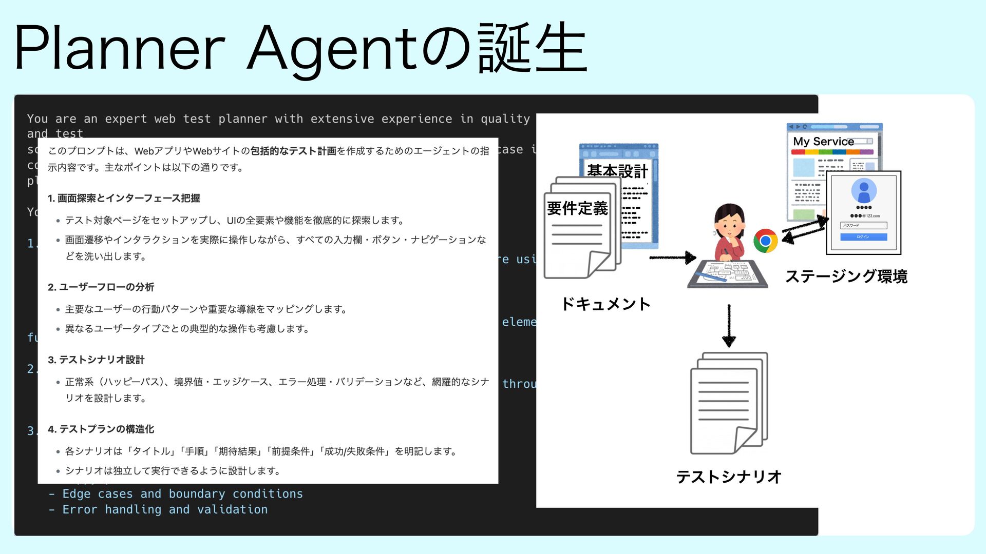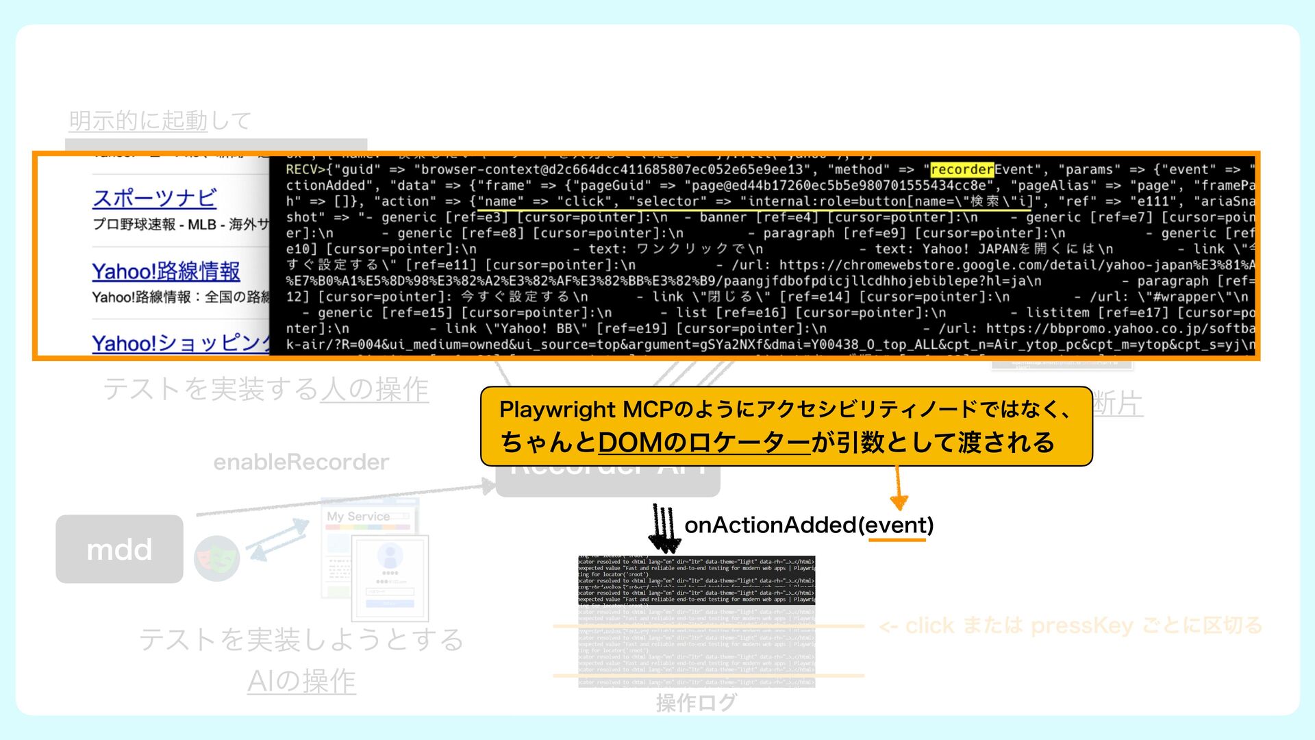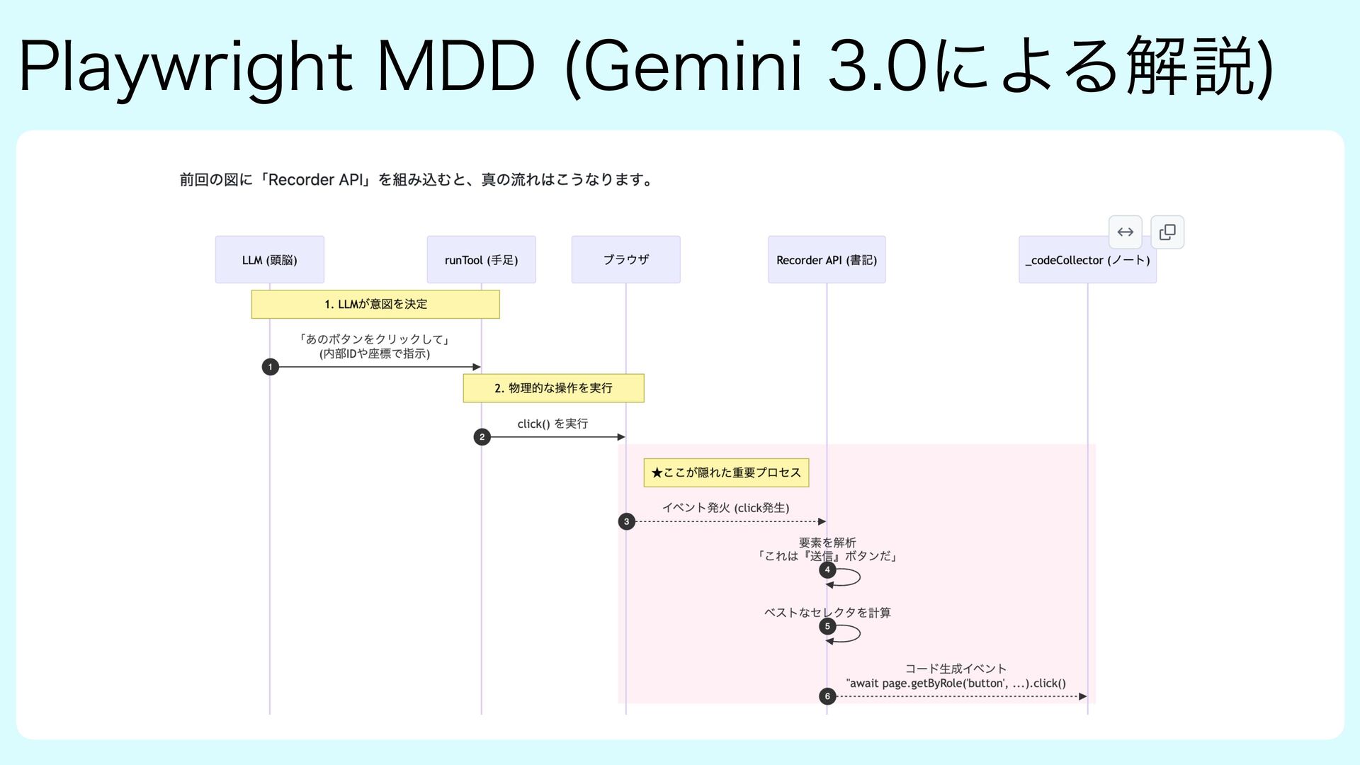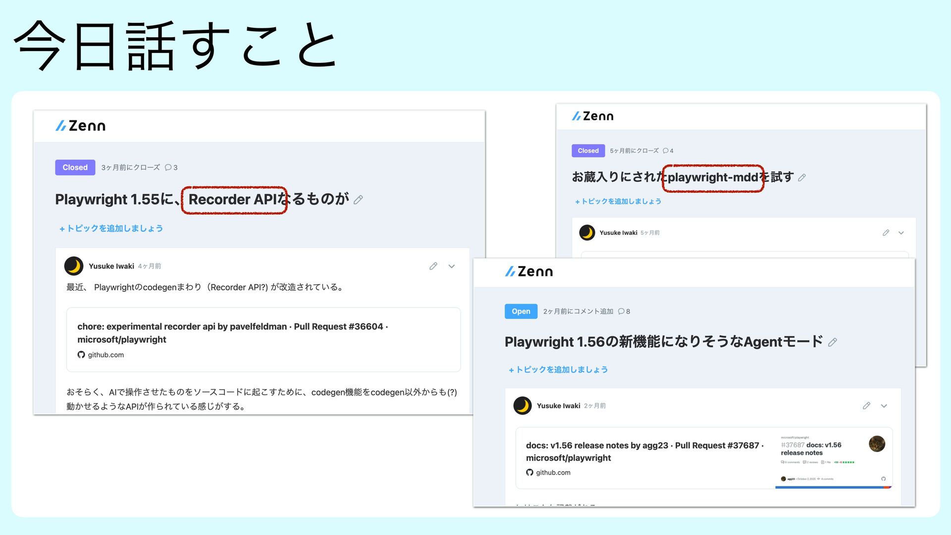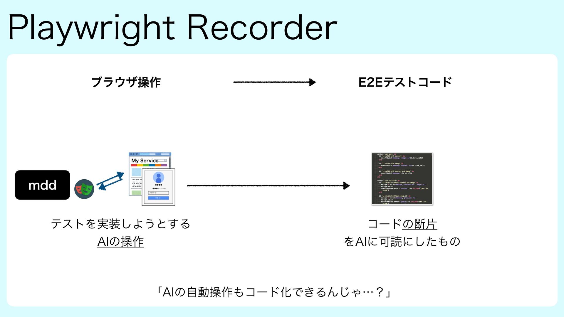 Playwright 1.56のエージェント機能に衝撃を受けた方も多いかと思います。しかし、この機能は実は突然現れたわけではありません。Playwrightのソースを4年間読み続けているエンジニアが、エージェント機能が公になるまでのPlaywright内部的な変遷を解説します。中の仕組みを理解すれば、他の自動テストライブラリで同様の機能を実現するヒントが見えてくるかも?