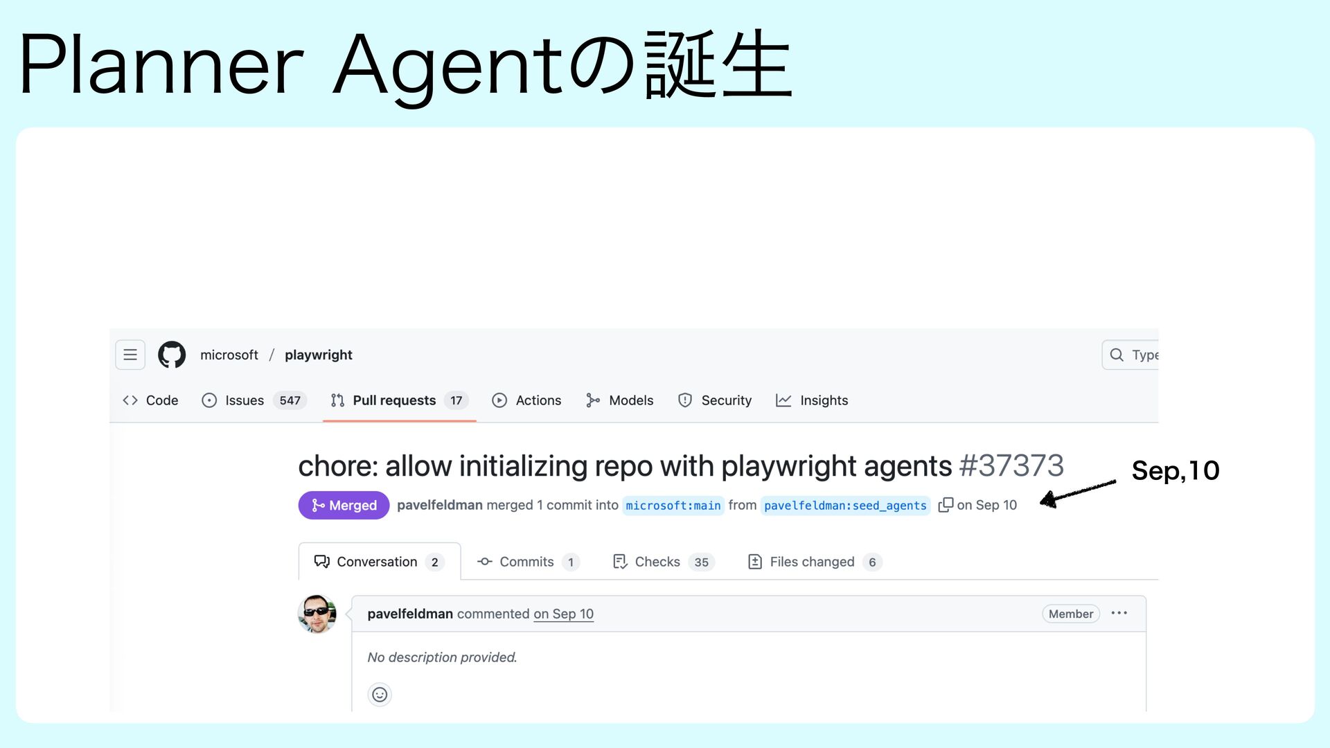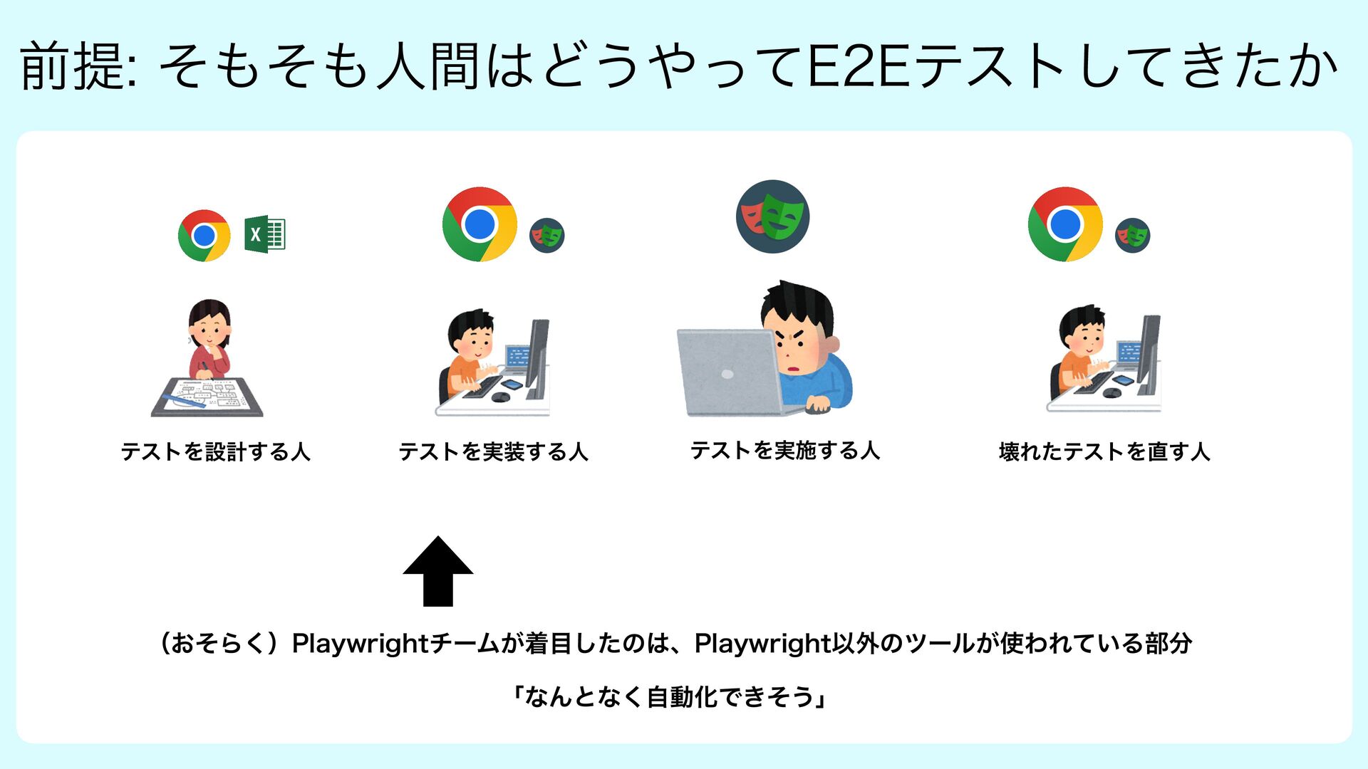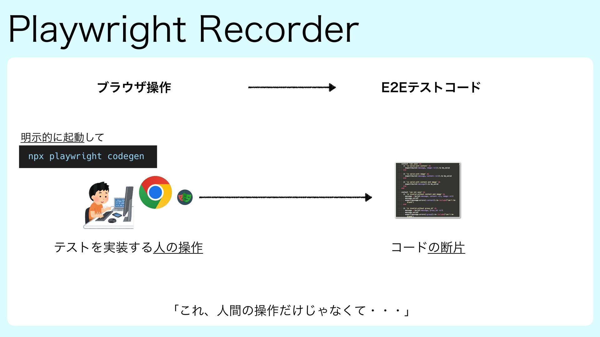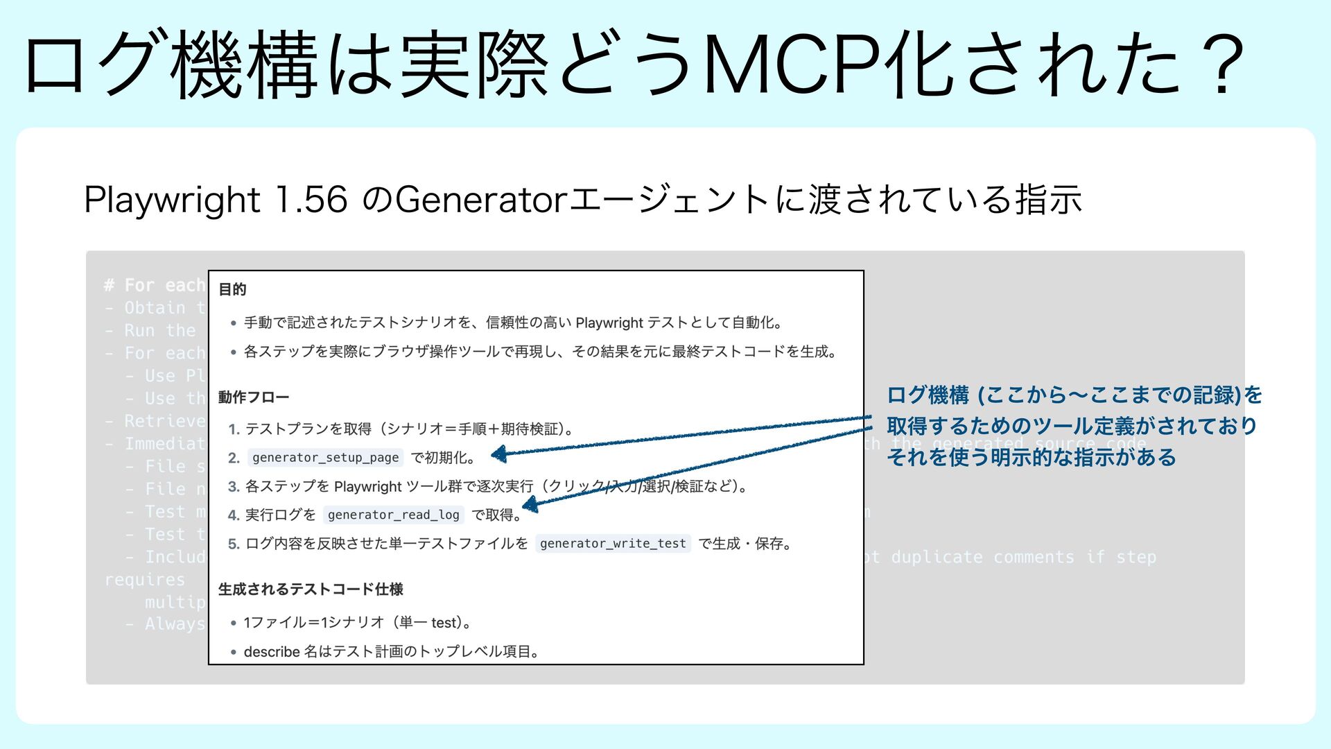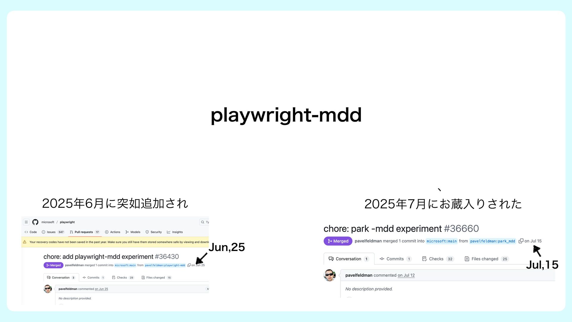 Playwright 1.56のエージェント機能に衝撃を受けた方も多いかと思います。しかし、この機能は実は突然現れたわけではありません。Playwrightのソースを4年間読み続けているエンジニアが、エージェント機能が公になるまでのPlaywright内部的な変遷を解説します。中の仕組みを理解すれば、他の自動テストライブラリで同様の機能を実現するヒントが見えてくるかも?