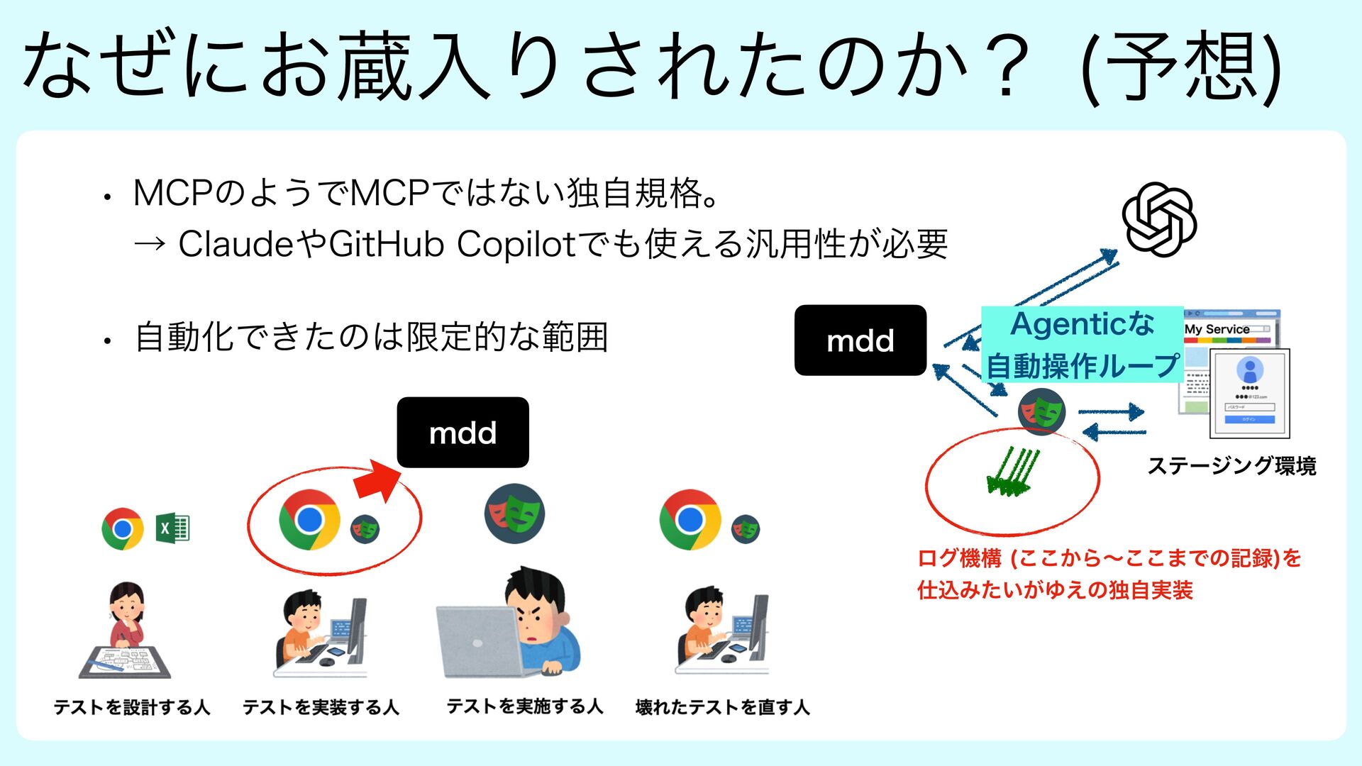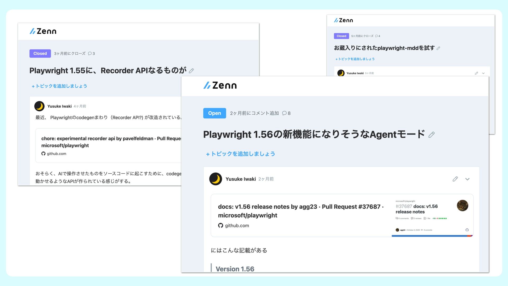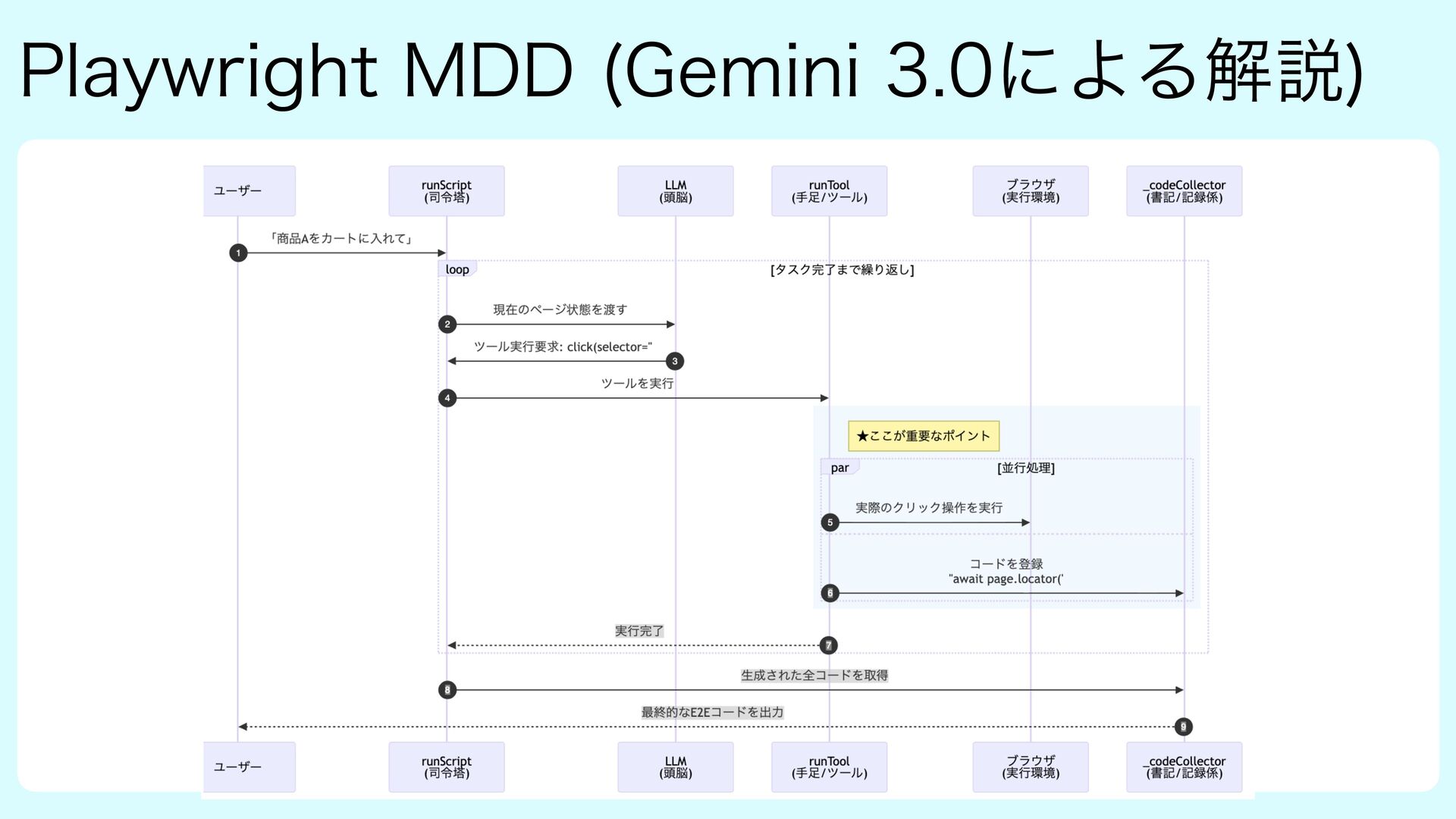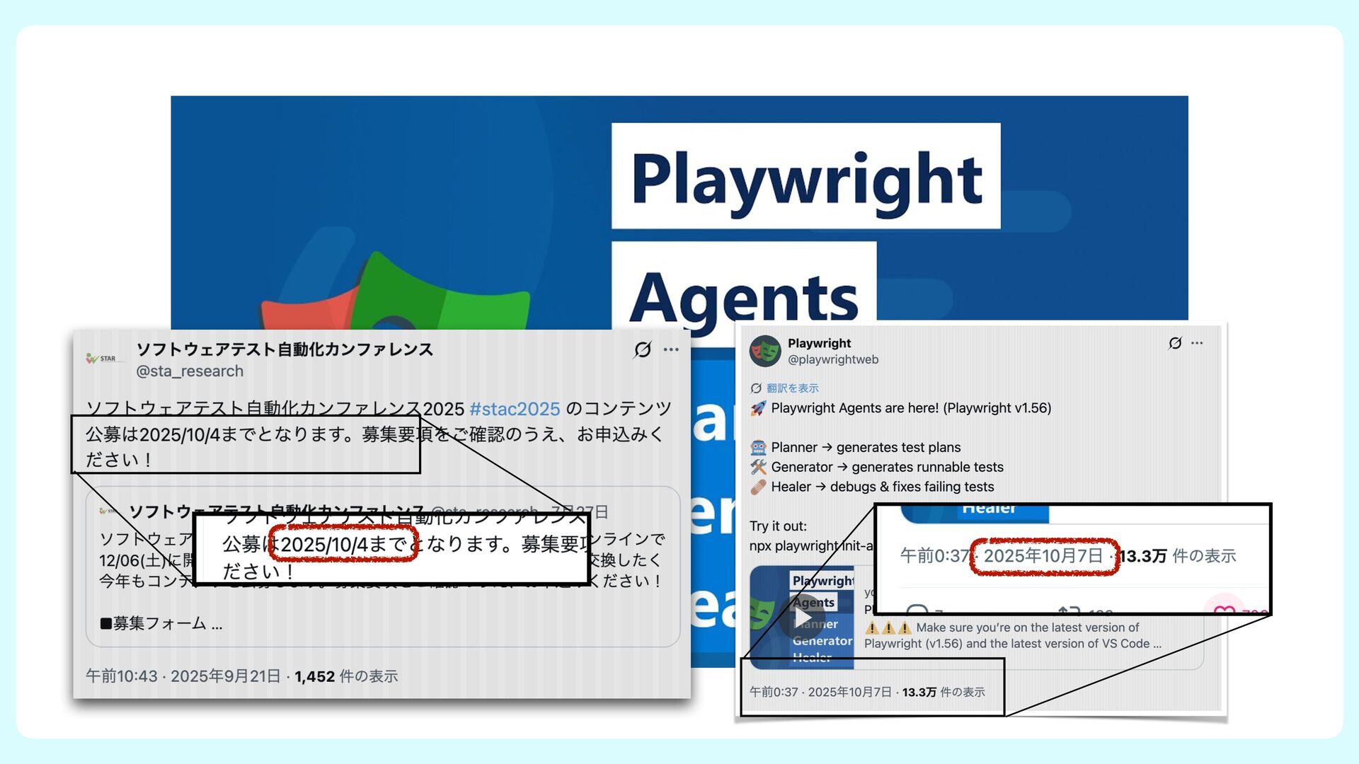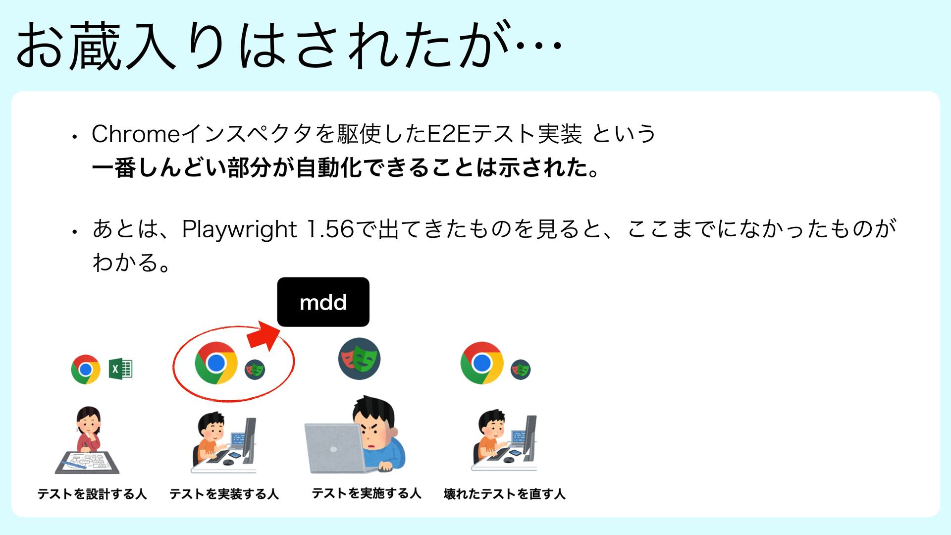 Playwright 1.56のエージェント機能に衝撃を受けた方も多いかと思います。しかし、この機能は実は突然現れたわけではありません。Playwrightのソースを4年間読み続けているエンジニアが、エージェント機能が公になるまでのPlaywright内部的な変遷を解説します。中の仕組みを理解すれば、他の自動テストライブラリで同様の機能を実現するヒントが見えてくるかも?