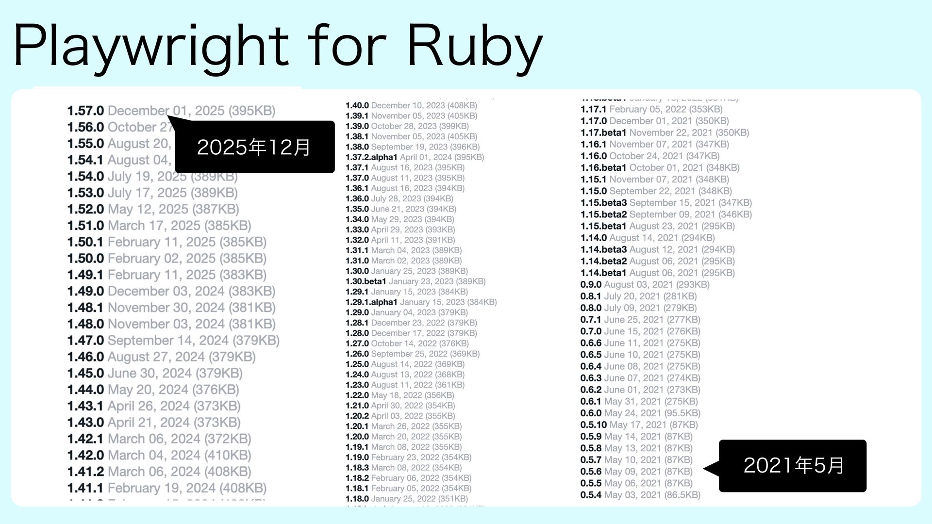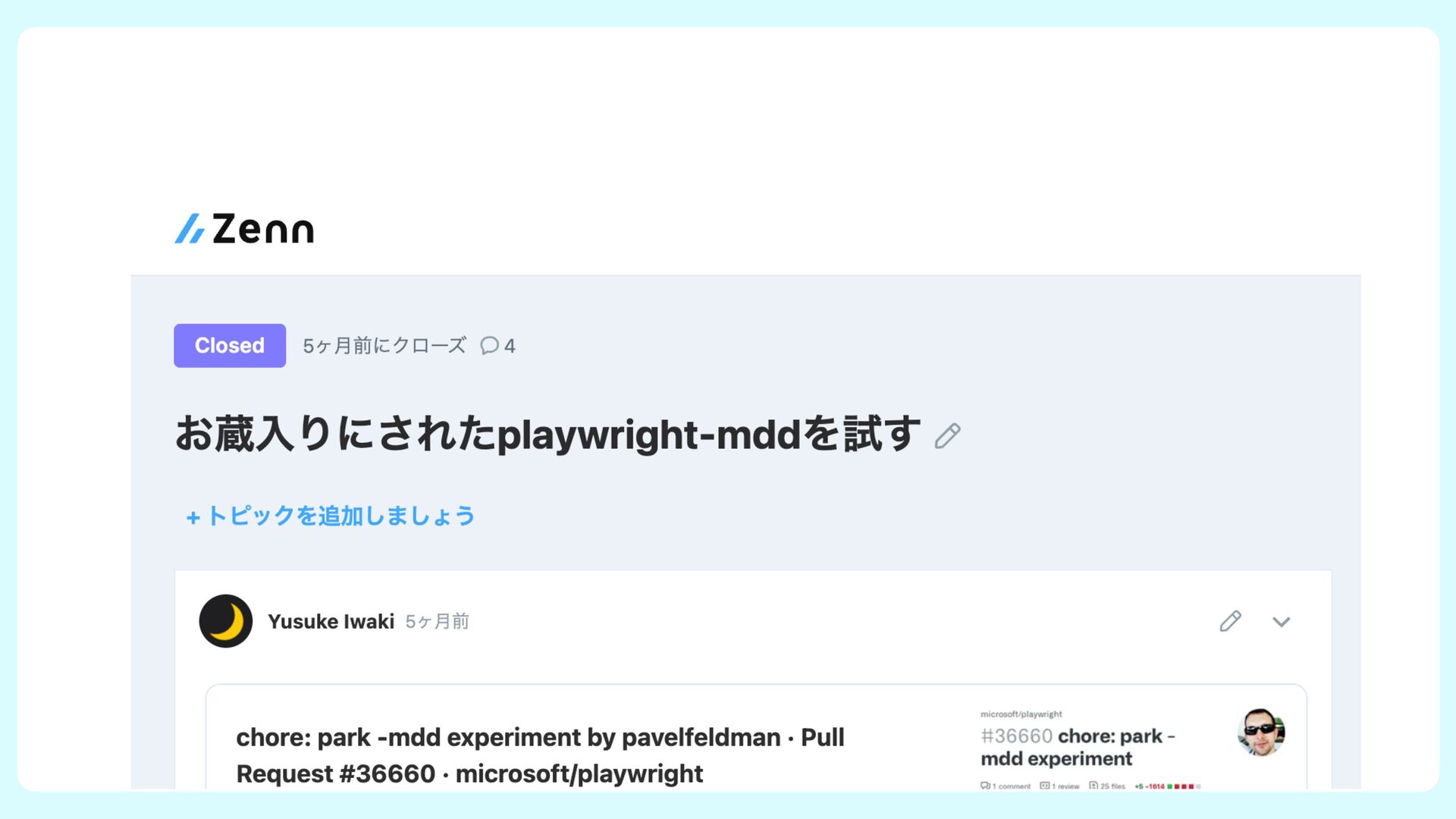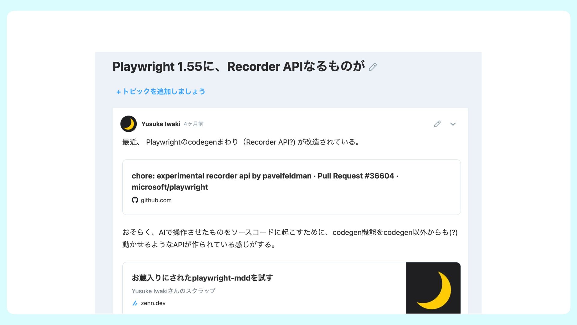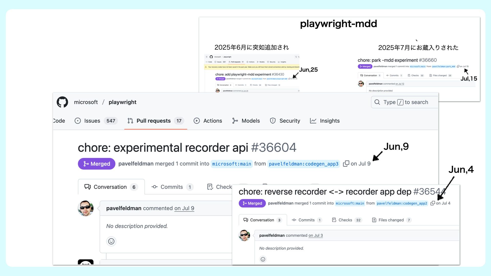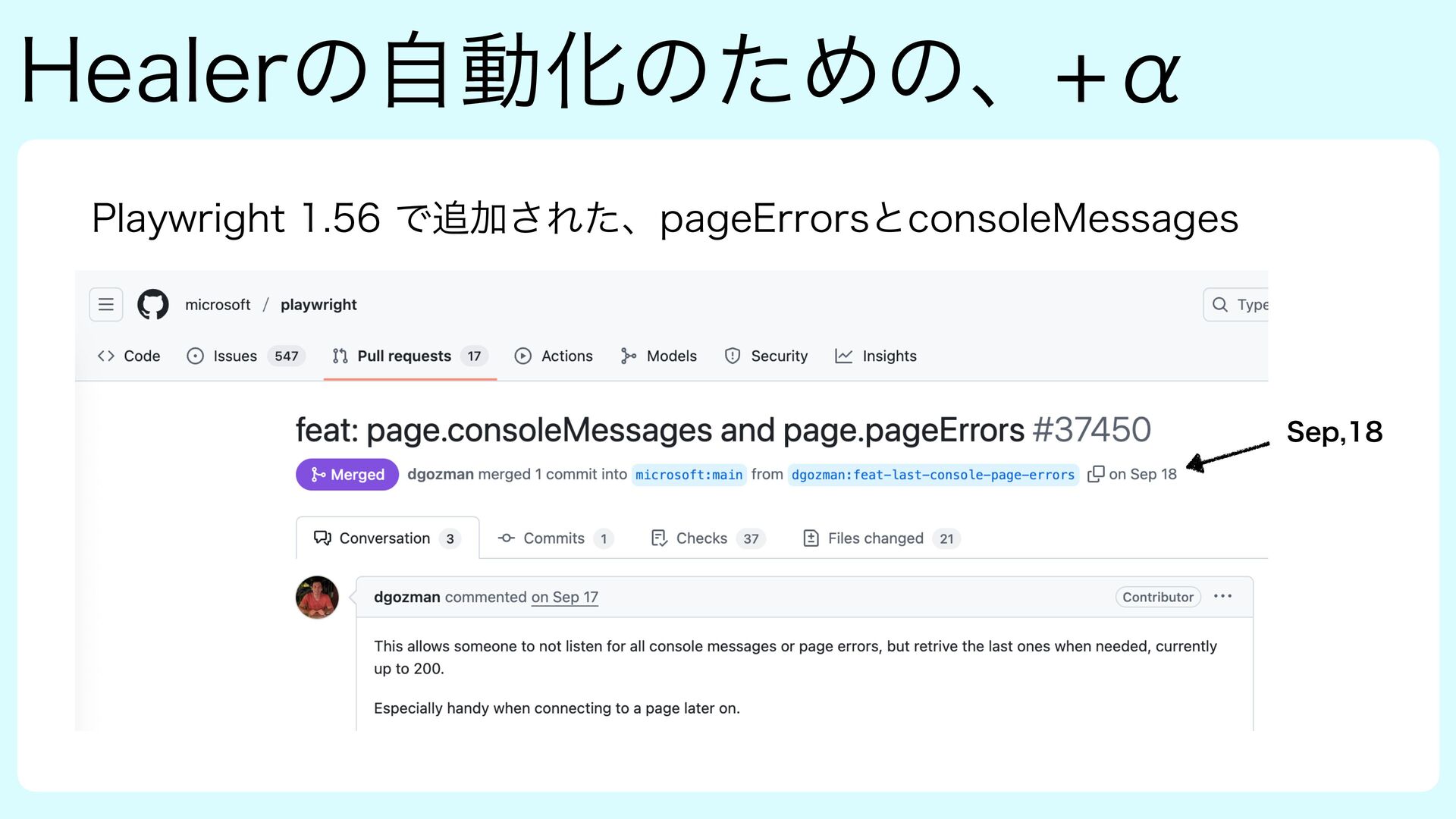 Playwright 1.56のエージェント機能に衝撃を受けた方も多いかと思います。しかし、この機能は実は突然現れたわけではありません。Playwrightのソースを4年間読み続けているエンジニアが、エージェント機能が公になるまでのPlaywright内部的な変遷を解説します。中の仕組みを理解すれば、他の自動テストライブラリで同様の機能を実現するヒントが見えてくるかも?