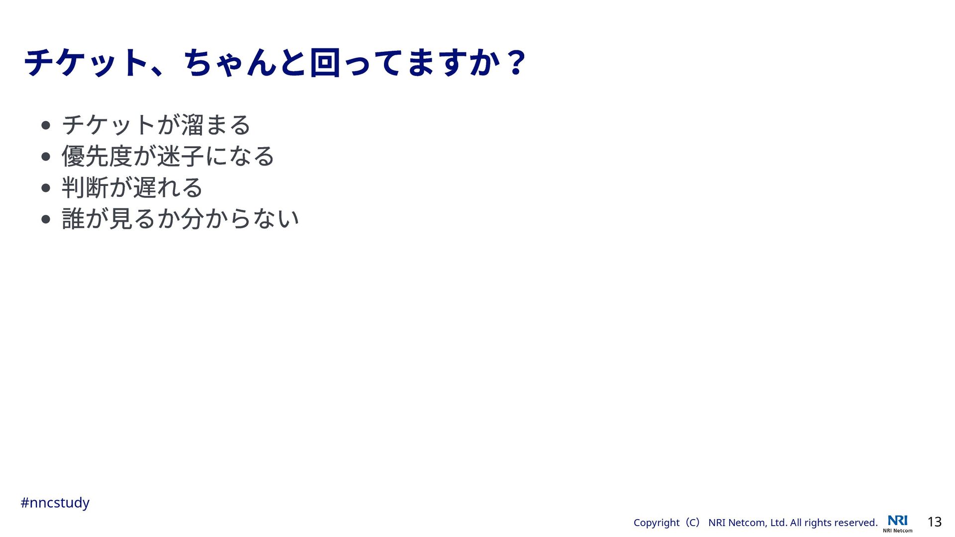 チケットが溜まる 優先度が迷子になる 判断が遅れる 誰が⾒るか分からない #nncstudy 13