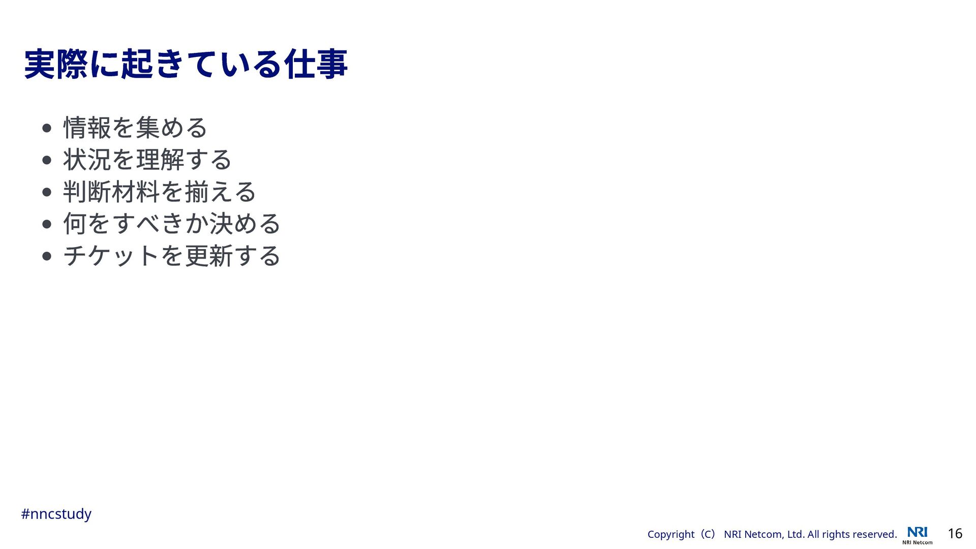 情報を集める 状況を理解する 判断材料を揃える 何をすべきか決める チケットを更新する #nncstudy 16