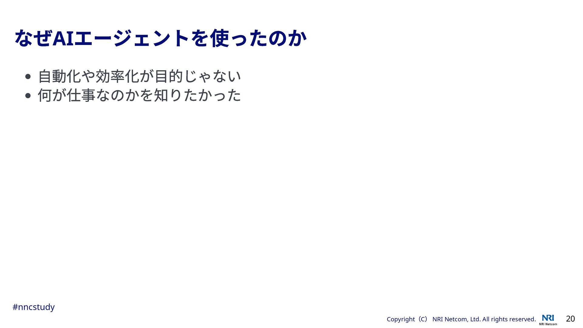 エージェントを使ったのか ⾃動化や効率化が⽬的じゃない 何が仕事なのかを知りたかった #nncstudy 20