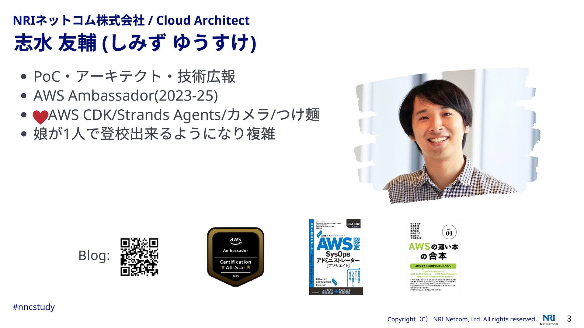 友輔 ( しみず ゆうすけ) NRI ネットコム株式会社 / Cloud Architect PoC ・アーキテクト・技術広報 AWS Ambassador(2023-25) AWS CDK/Strands Agents/ カメラ/ つけ麺 娘が1 人で登校出来るようになり複雑 #nncstudy Blog: 3