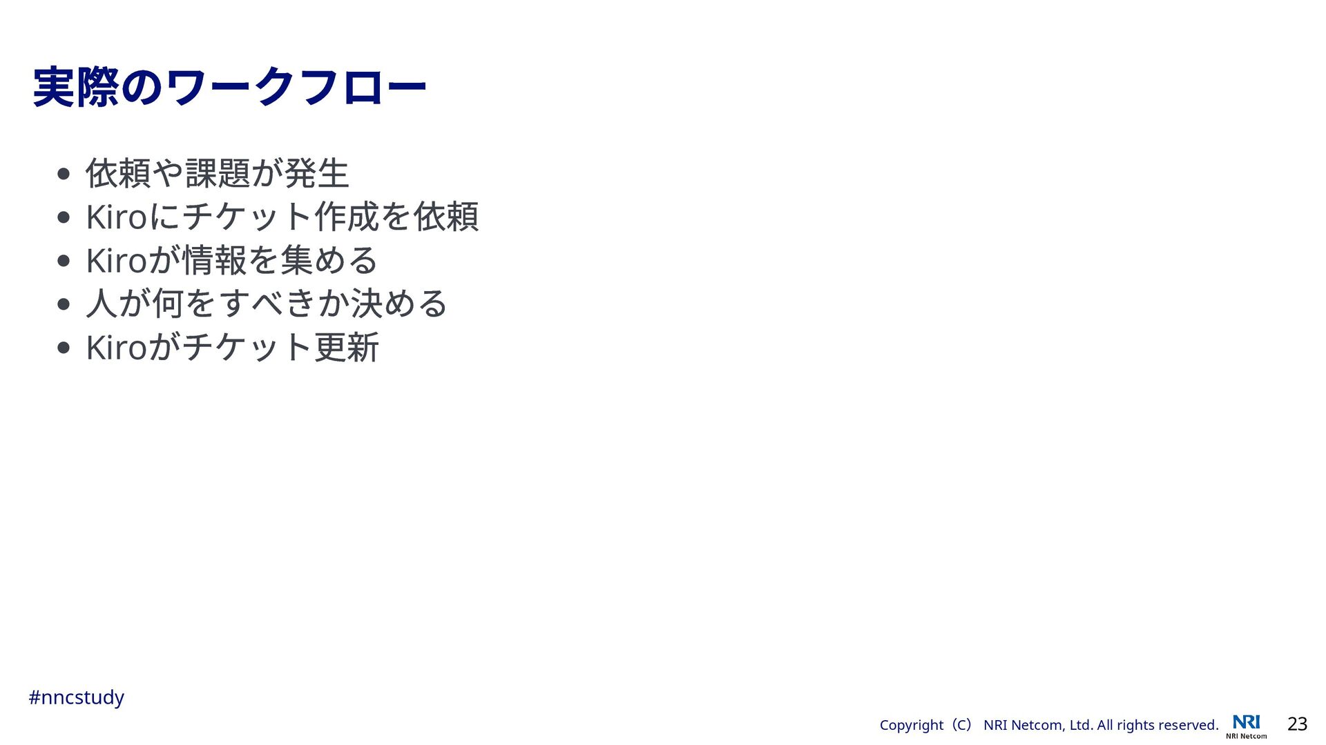 依頼や課題が発⽣ Kiro にチケット作成を依頼 Kiro が情報を集める 人が何をすべきか決める Kiro がチケット更新 #nncstudy 23