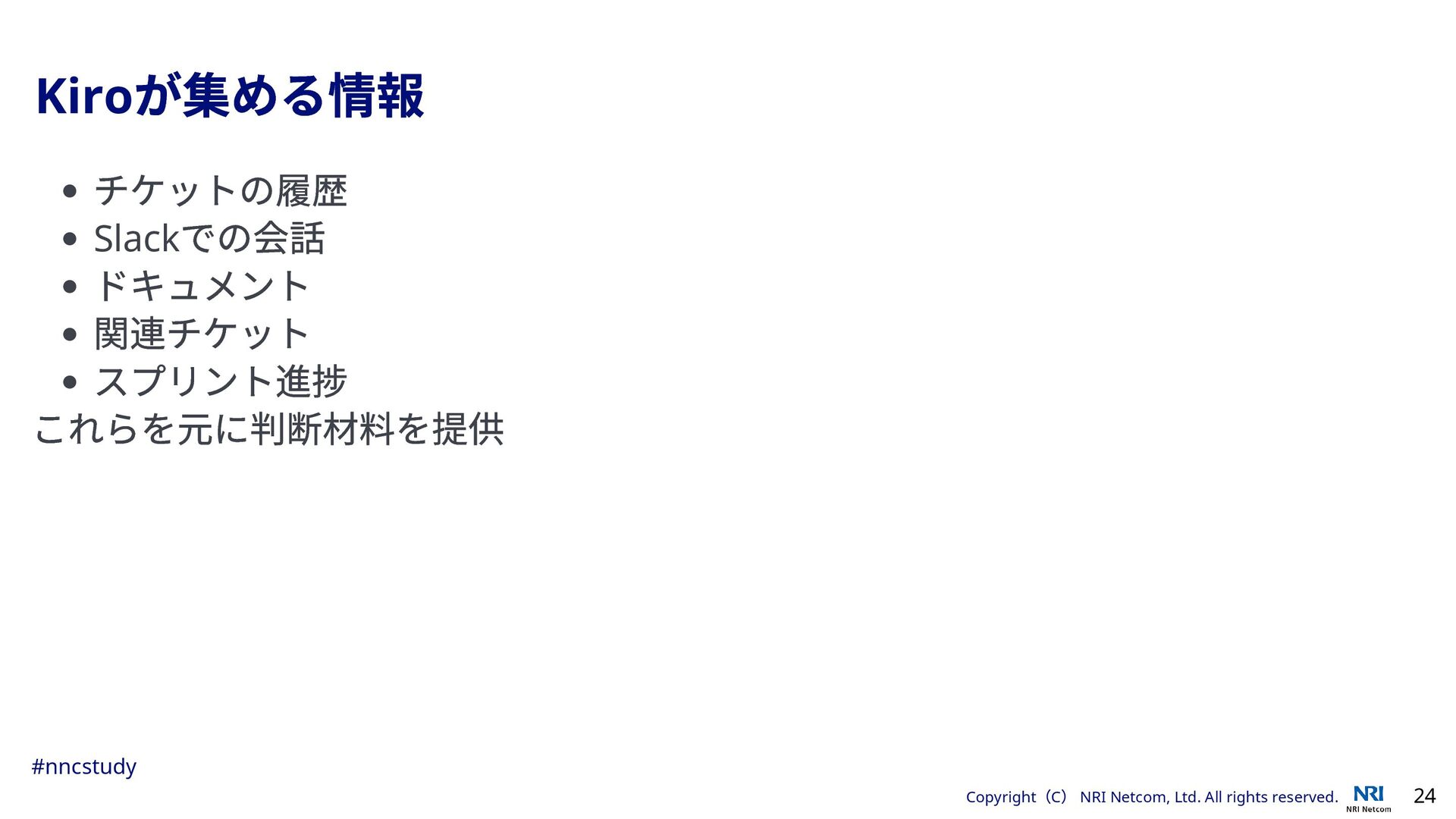 が集める情報 チケットの履歴 Slack での会話 ドキュメント 関連チケット スプリント進捗 これらを元に判断材料を提供 #nncstudy 24