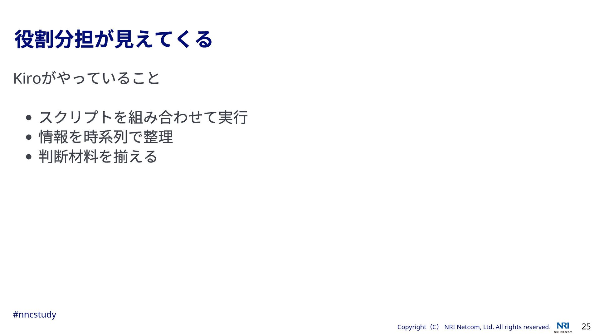 Kiro がやっていること スクリプトを組み合わせて実⾏ 情報を時系列で整理 判断材料を揃える #nncstudy 25