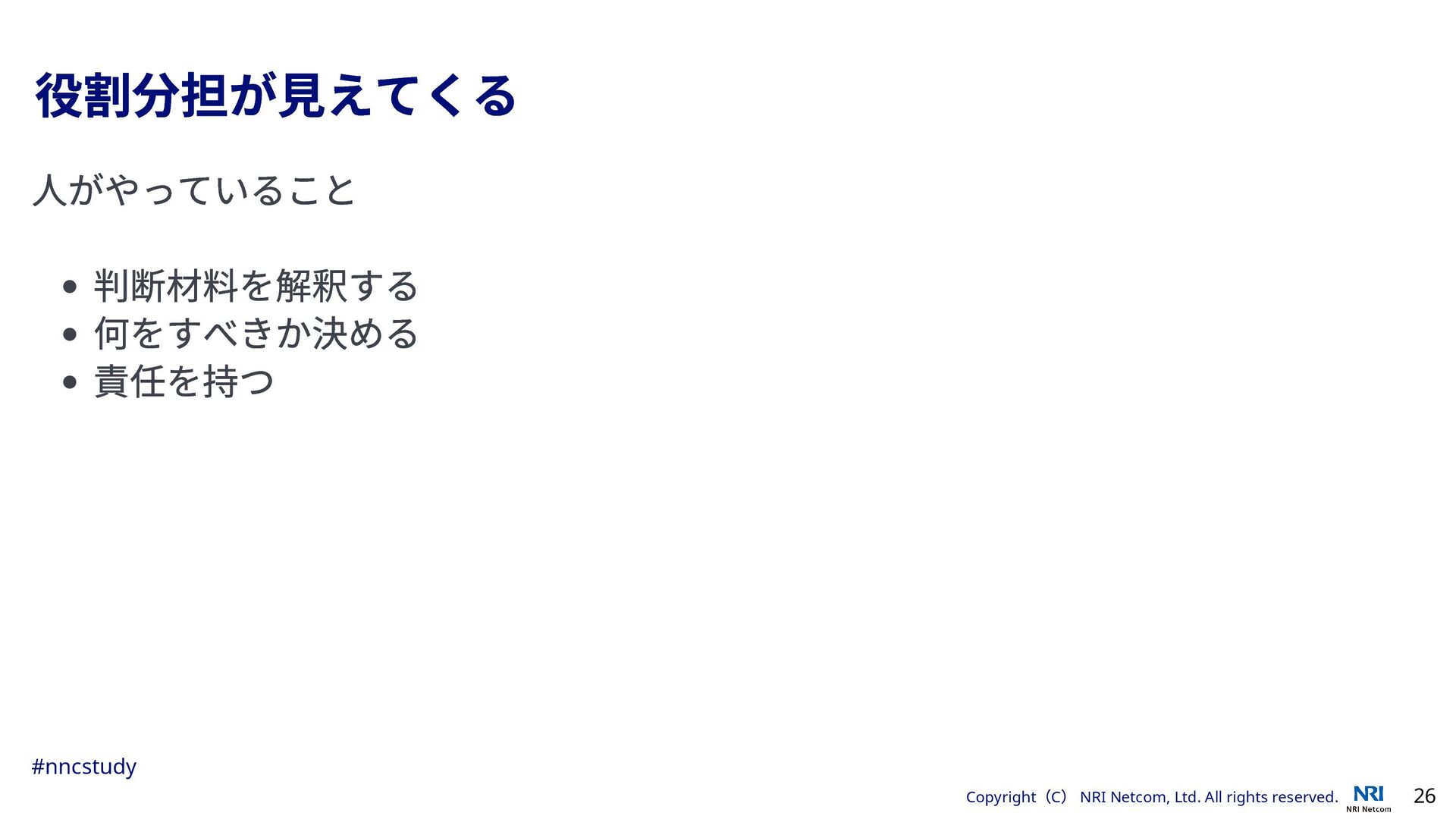 人がやっていること 判断材料を解釈する 何をすべきか決める 責任を持つ #nncstudy 26