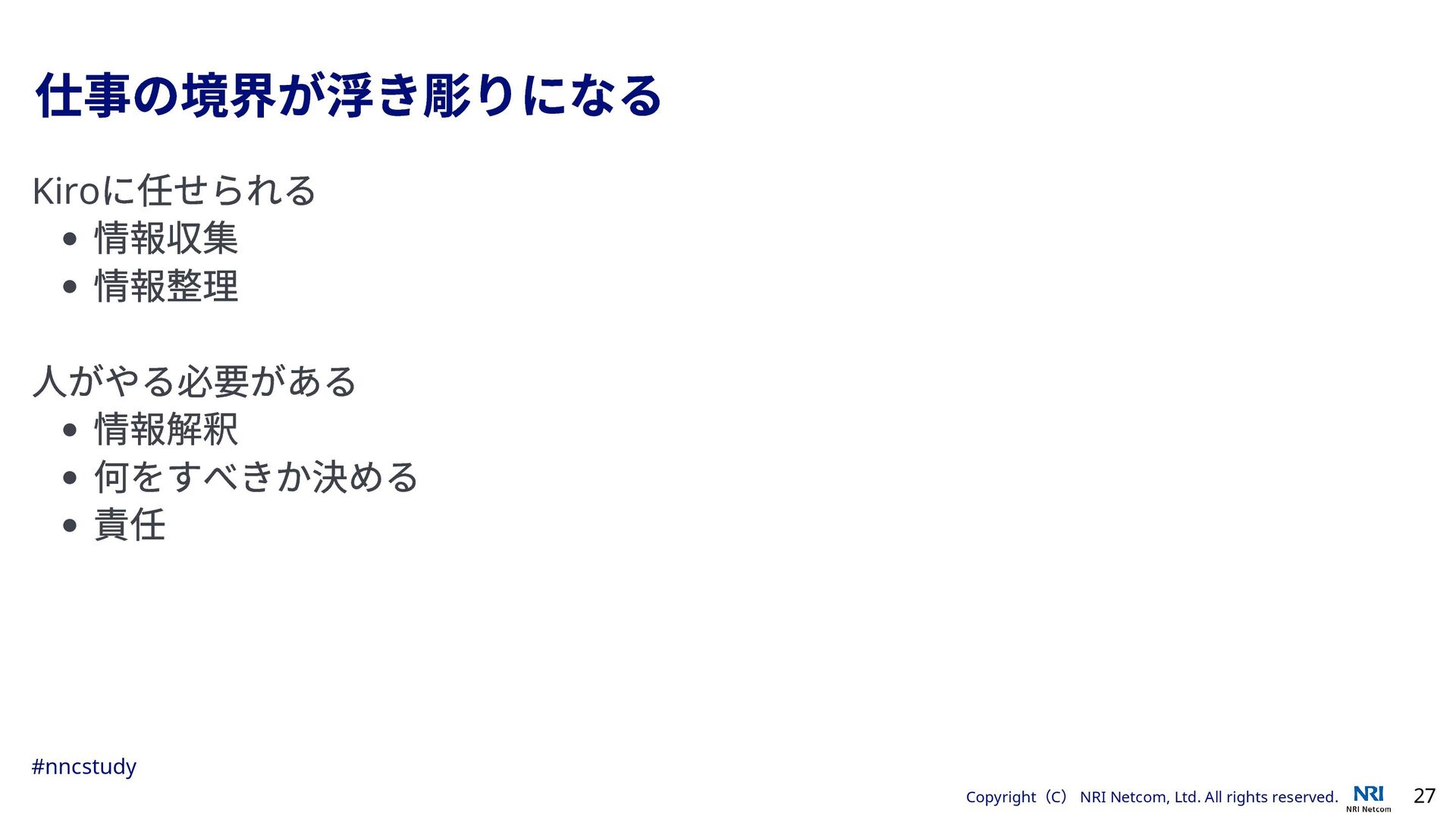 Kiro に任せられる 情報収集 情報整理 人がやる必要がある 情報解釈 何をすべきか決める 責任 #nncstudy 27