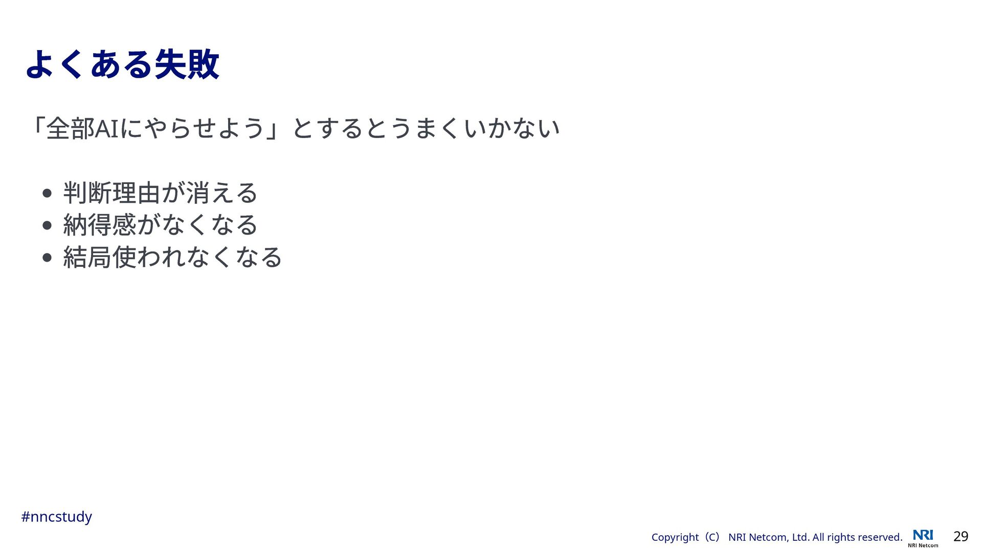 「全部AI にやらせよう」とするとうまくいかない 判断理由が消える 納得感がなくなる 結局使われなくなる #nncstudy 29