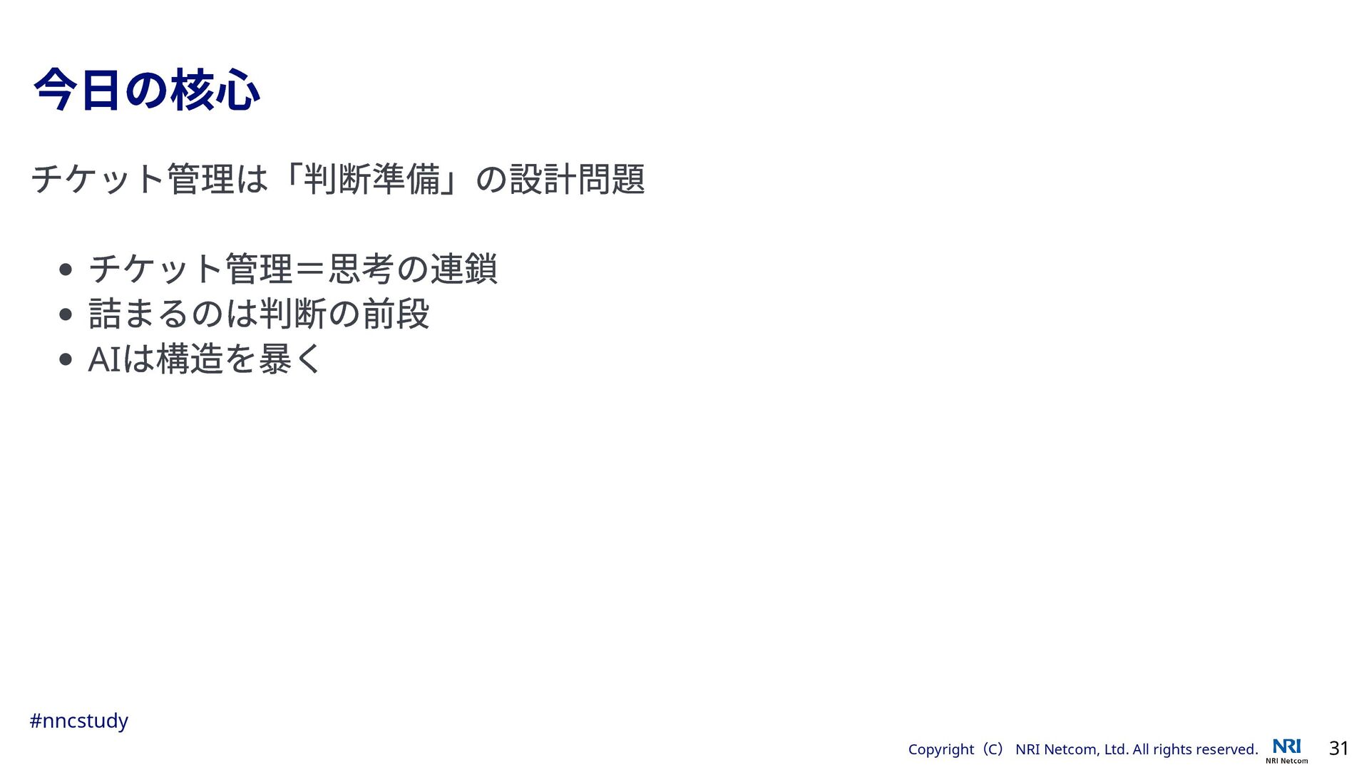 チケット管理は「判断準備」の設計問題 チケット管理=思考の連鎖 詰まるのは判断の前段 AI は構造を暴く #nncstudy 31