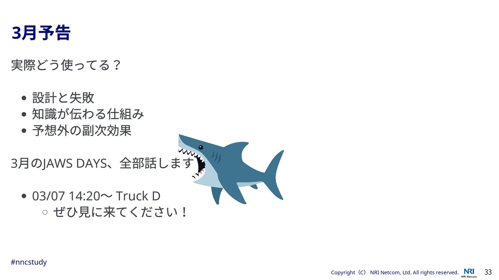 ⽉予告 実際どう使ってる? 設計と失敗 知識が伝わる仕組み 予想外の副次効果 3 ⽉のJAWS DAYS 、全部話します 03/07 14:20 〜 Truck D ぜひ⾒に来てください! #nncstudy 33