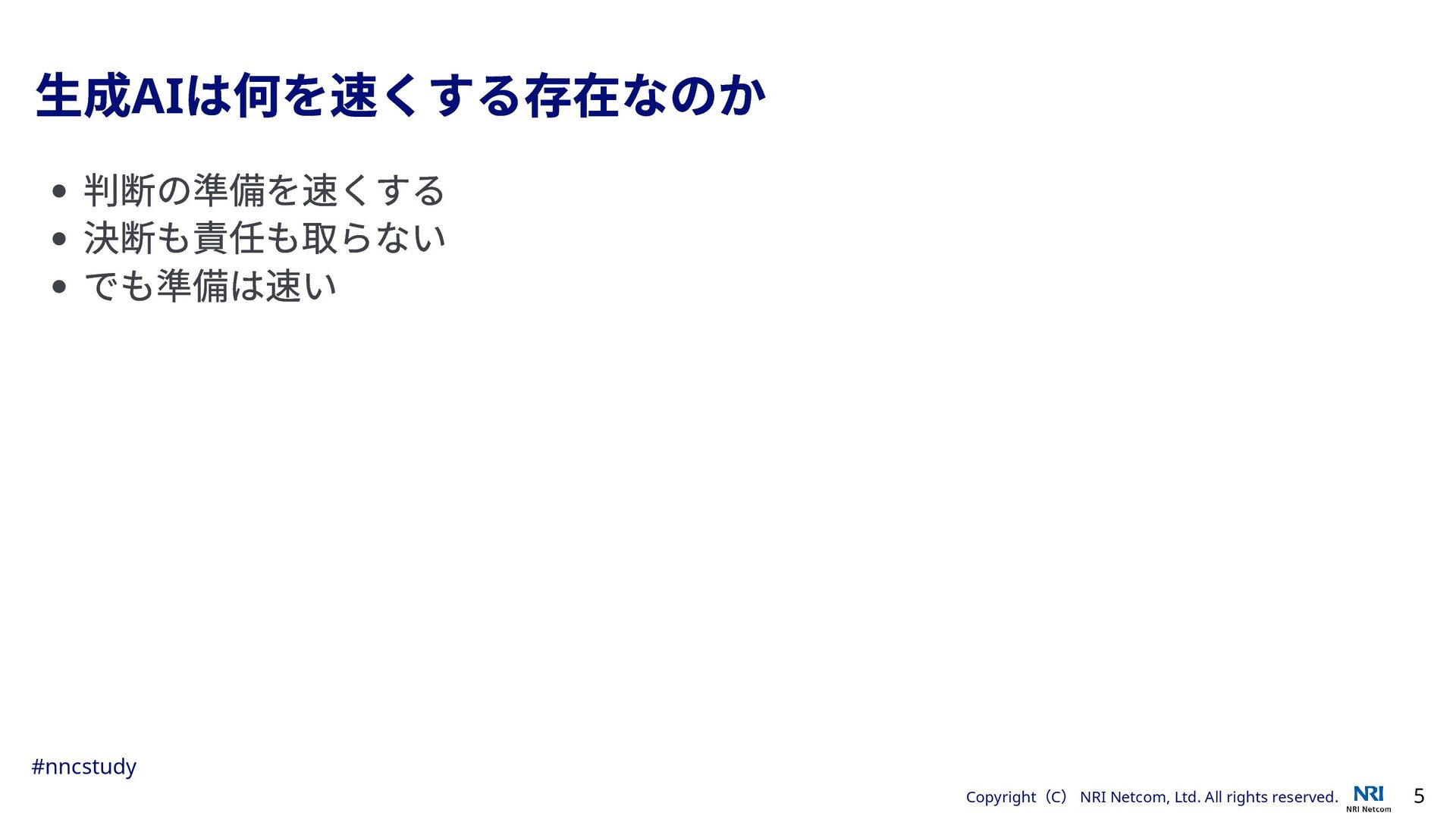 は何を速くする存在なのか 判断の準備を速くする 決断も責任も取らない でも準備は速い #nncstudy 5
