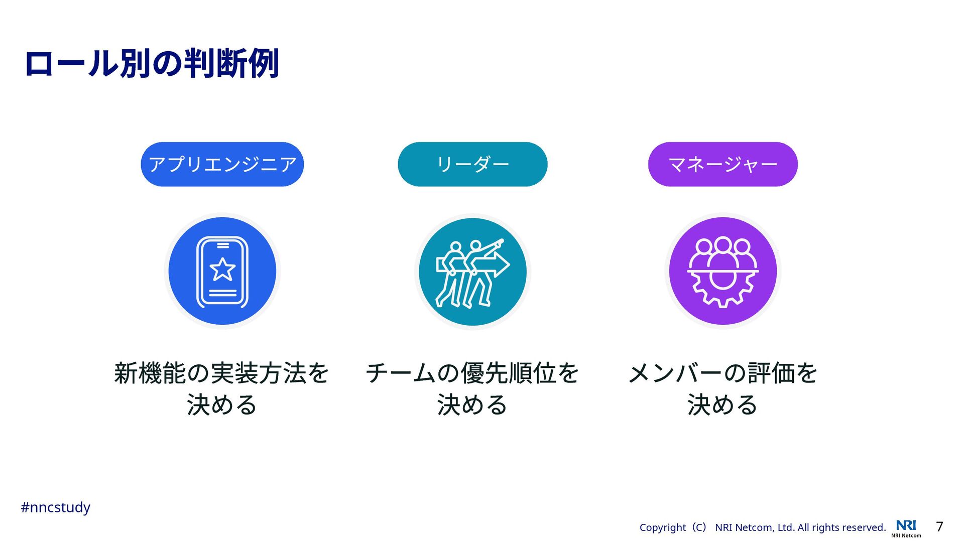 #nncstudy アプリエンジニア リーダー マネージャー 7 新機能の実装方法を 決める チームの優先順位を 決める メンバーの評価を 決める