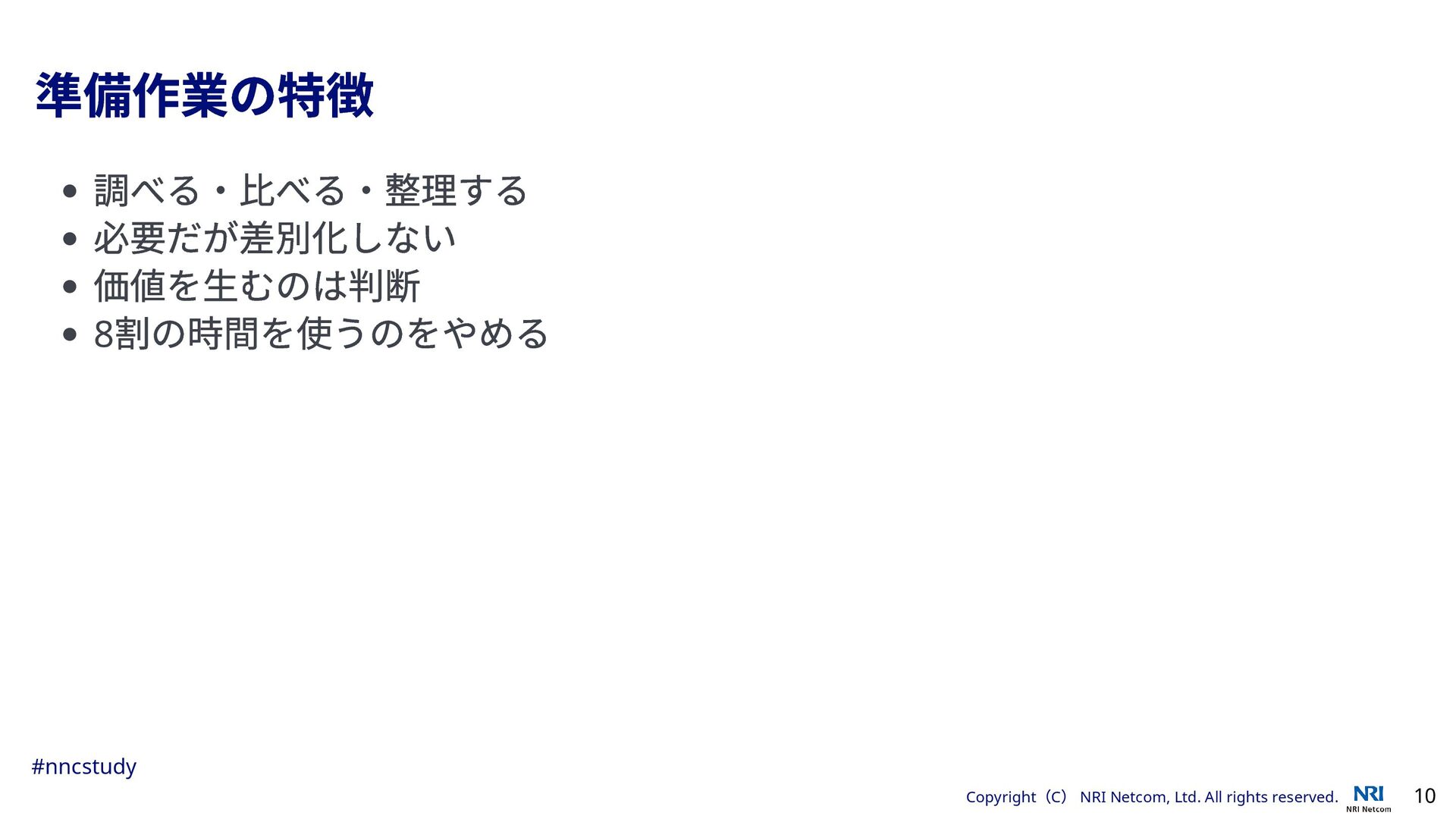 調べる・比べる・整理する 必要だが差別化しない 価値を⽣むのは判断 8 割の時間を使うのをやめる #nncstudy 10