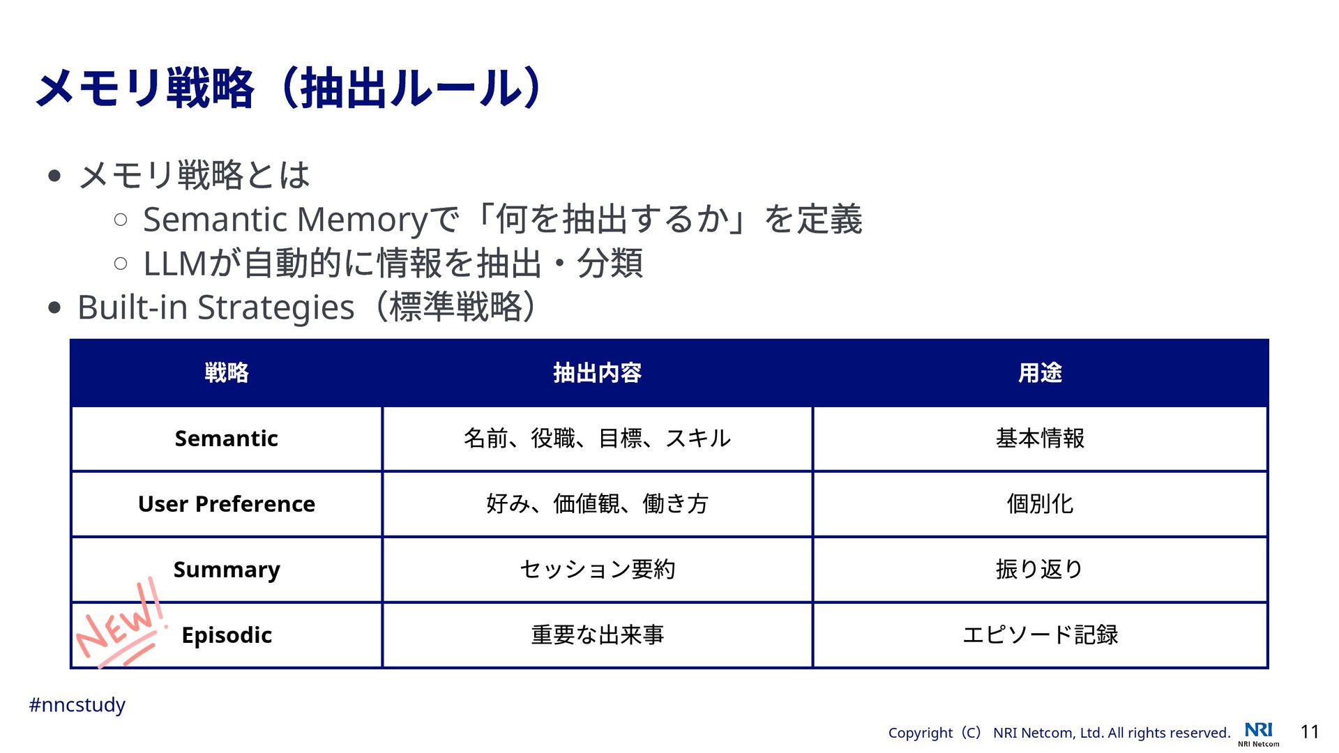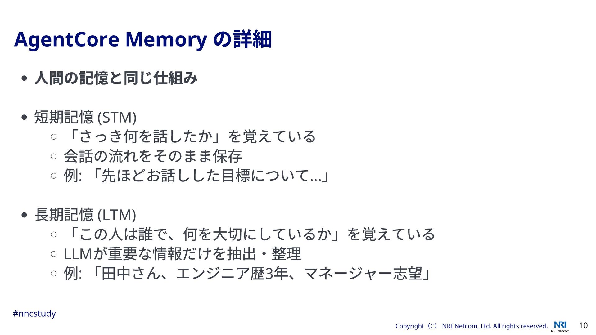 Memory の詳細 人間の記憶と同じ仕組み 短期記憶 (STM) 「さっき何を話したか」を覚えている 会話の流れをそのまま保存 例: 「先ほどお話しした目標について... 」 長期記憶 (LTM) 「この人は誰で、何を大切にしているか」を覚えている LLM が重要な情報だけを抽出・整理 例: 「田中さん、エンジニア歴3 年、マネージャー志望」 #nncstudy 10