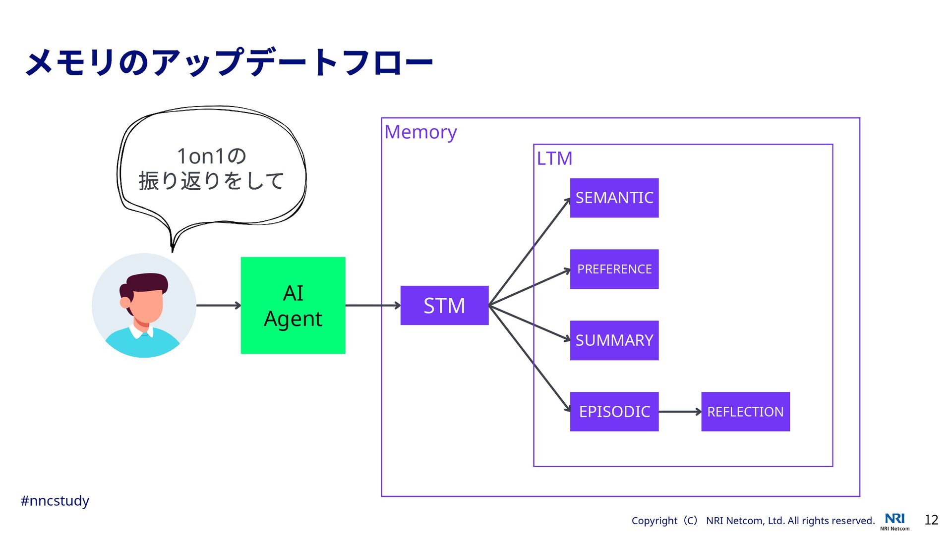 #nncstudy Memory AI Agent STM SEMANTIC PREFERENCE SUMMARY EPISODIC REFLECTION 12 LTM 1on1 の 振り返りをして