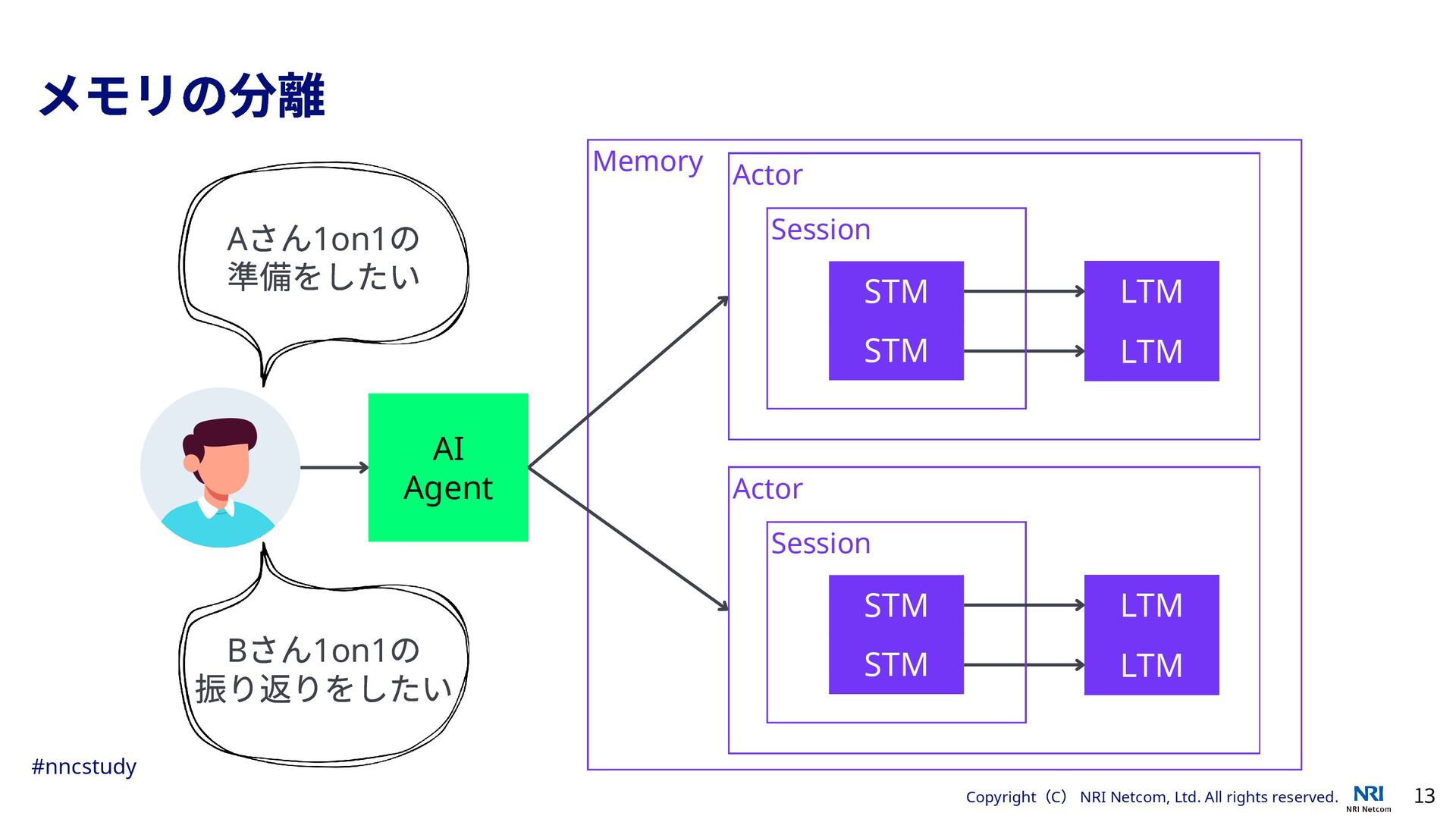 メモリの分離 #nncstudy AI Agent Actor LTM Session STM STM LTM Actor LTM Session STM STM LTM 13 A さん1on1 の 準備をしたい B さん1on1 の 振り返りをしたい