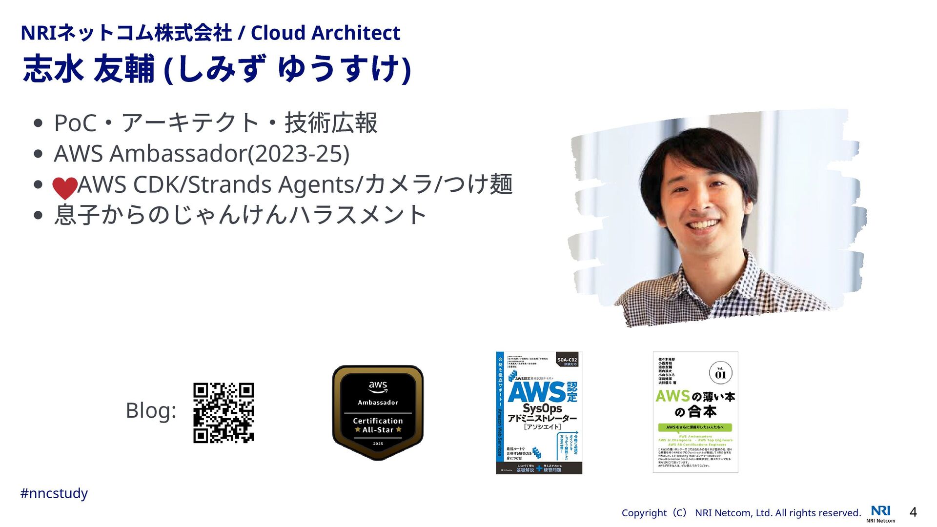 友輔 ( しみず ゆうすけ) NRI ネットコム株式会社 / Cloud Architect PoC ・アーキテクト・技術広報 AWS Ambassador(2023-25)  AWS CDK/Strands Agents/ カメラ/ つけ麺 息子からのじゃんけんハラスメント #nncstudy Blog: 4