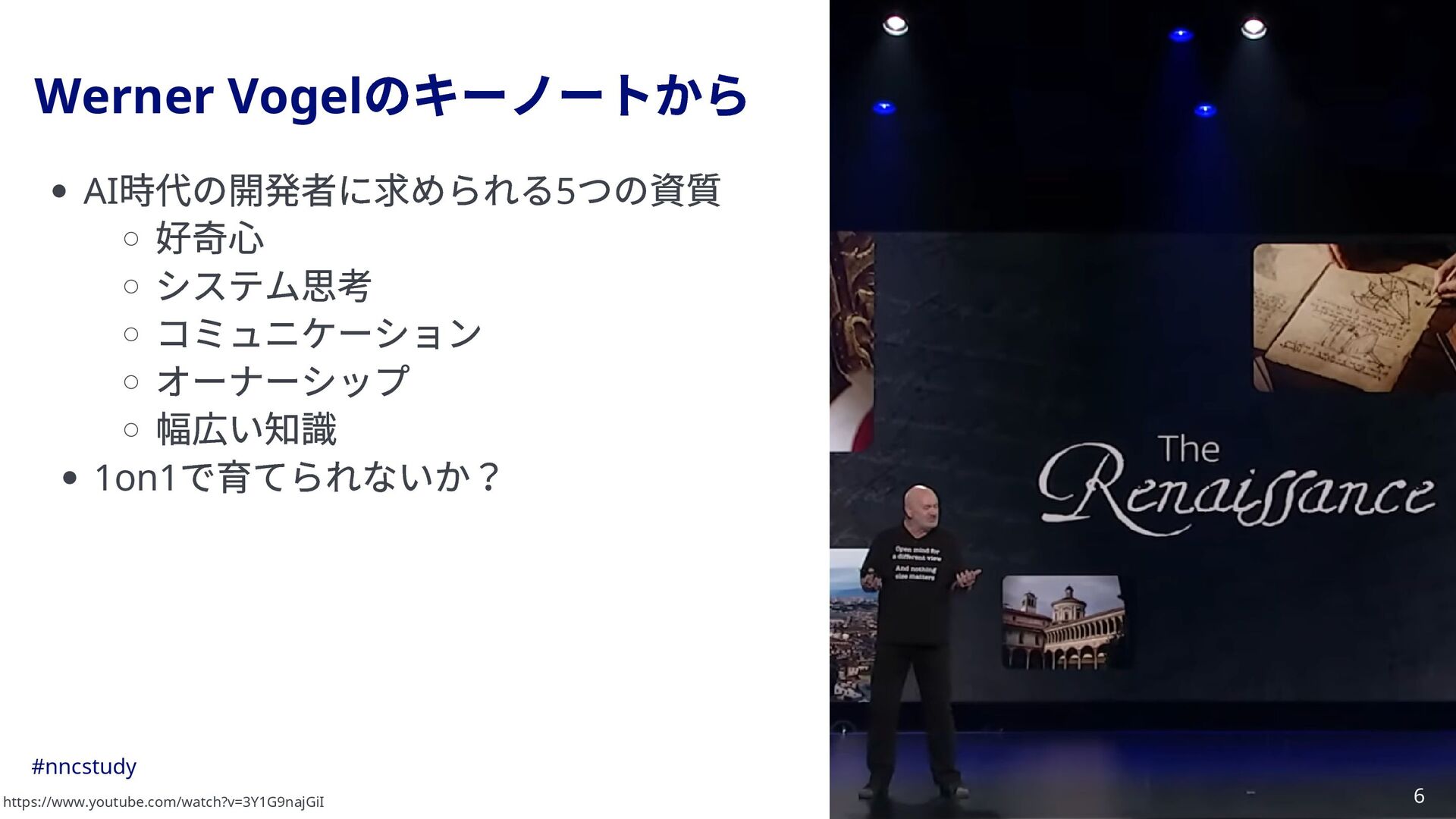 Vogel のキーノートから AI 時代の開発者に求められる5 つの資質 好奇心 システム思考 コミュニケーション オーナーシップ 幅広い知識 1on1 で育てられないか? #nncstudy 6 https://www.youtube.com/watch?v=3Y1G9najGiI