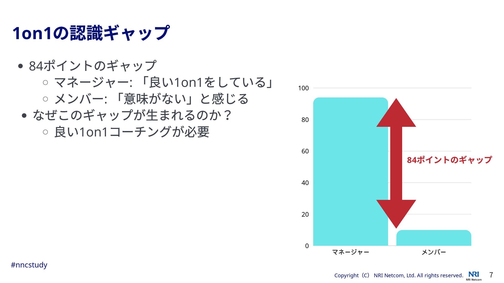 の認識ギャップ 84 ポイントのギャップ マネージャー: 「良い1on1 をしている」 メンバー: 「意味がない」と感じる なぜこのギャップが生まれるのか? 良い1on1 コーチングが必要 #nncstudy マネージャー メンバー 0 20 40 60 80 100 84 ポイントのギャップ 7
