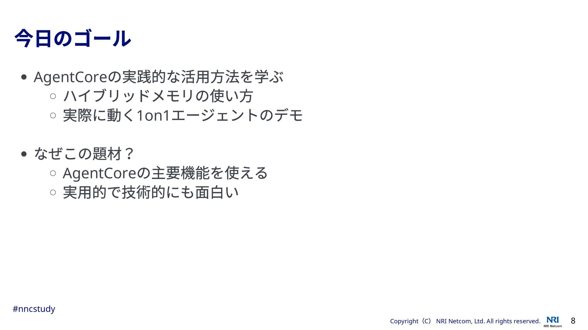 AgentCore の実践的な活用方法を学ぶ ハイブリッドメモリの使い方 実際に動く1on1 エージェントのデモ なぜこの題材? AgentCore の主要機能を使える 実用的で技術的にも面白い #nncstudy 8