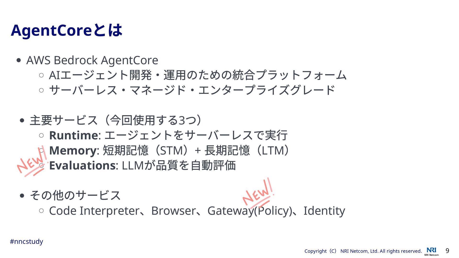 とは AWS Bedrock AgentCore AI エージェント開発・運用のための統合プラットフォーム サーバーレス・マネージド・エンタープライズグレード 主要サービス(今回使用する3 つ) Runtime: エージェントをサーバーレスで実行 Memory: 短期記憶(STM )+ 長期記憶(LTM ) Evaluations: LLM が品質を自動評価 その他のサービス Code Interpreter 、Browser 、Gateway(Policy) 、Identity #nncstudy 9