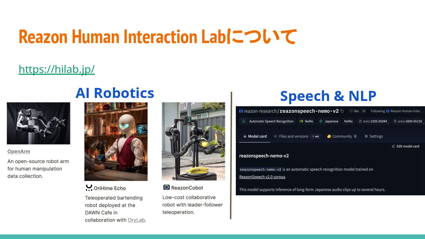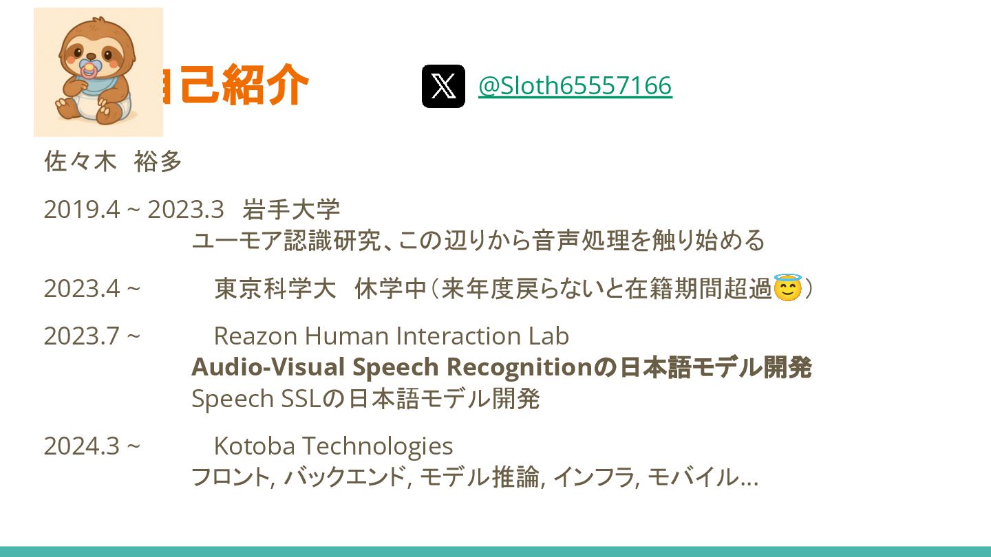 ~     Reazon Human Interaction Lab          Audio-Visual Speech Recognitionの日本語モデル開発          Speech SSLの日本語モデル開発 2024.3 ~     Kotoba Technologies          フロント, バックエンド, モデル推論, インフラ, モバイル... @Sloth65557166
