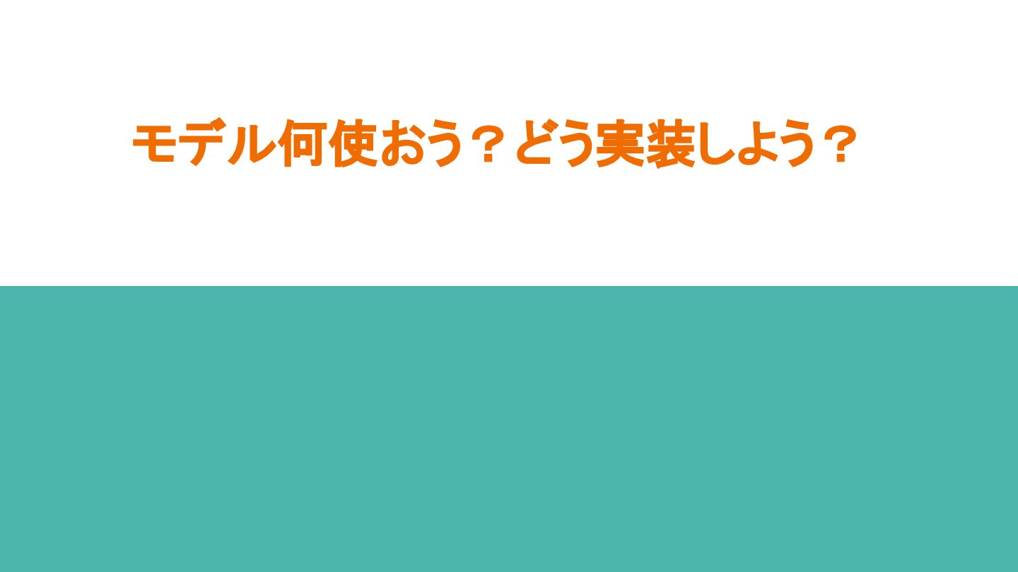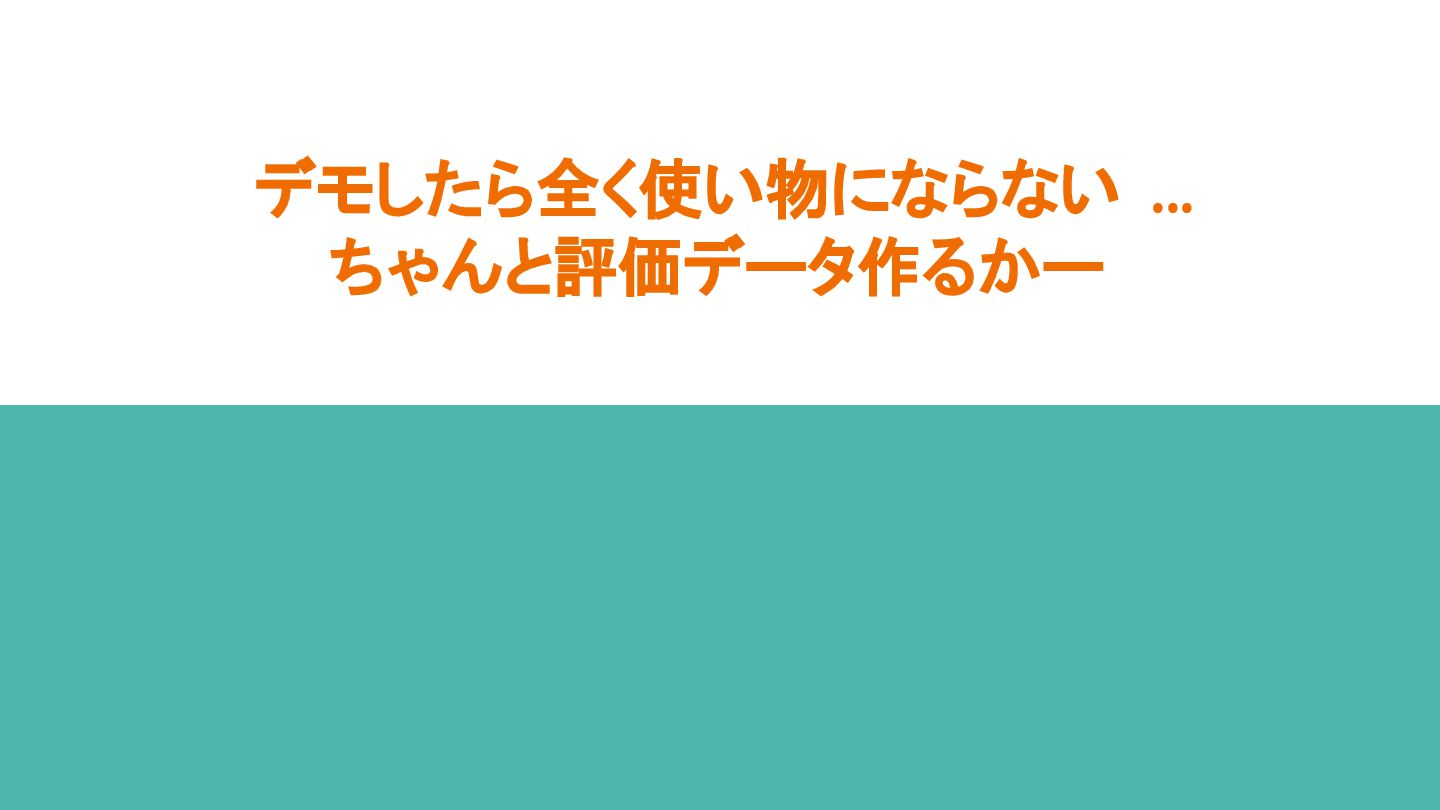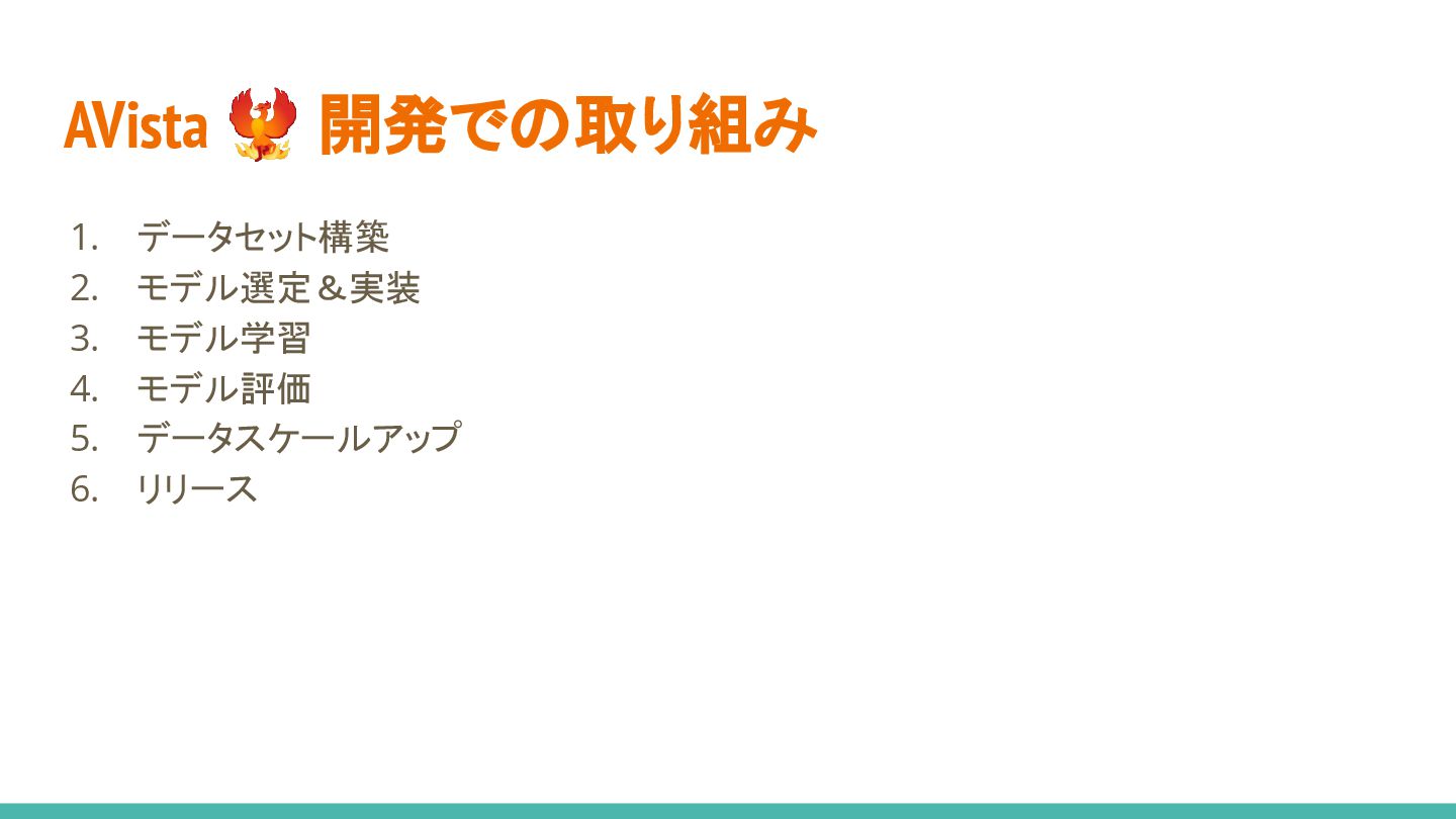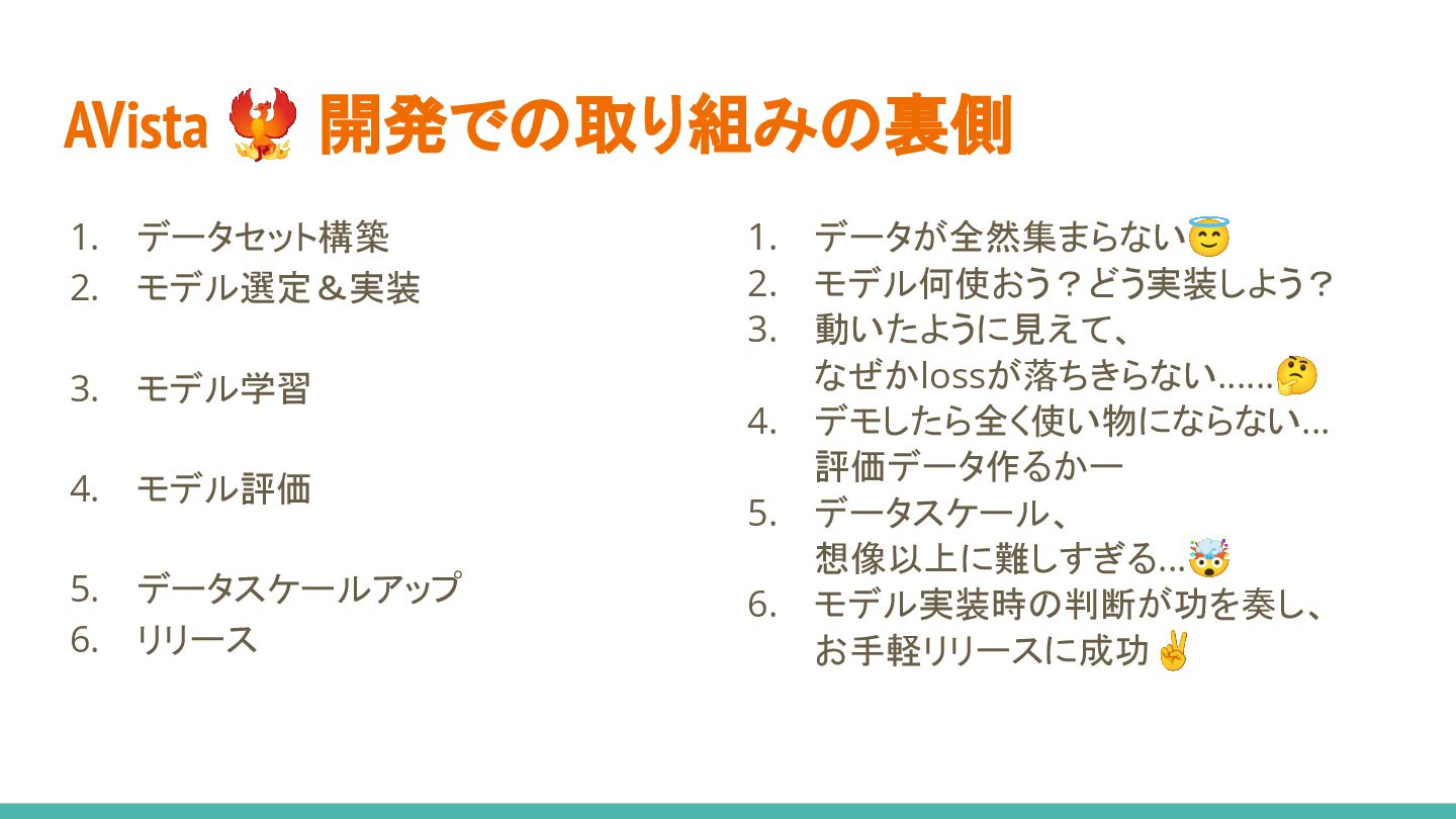 4. デモしたら全く使い物にならない... 評価データ作るかー 5. データスケール、 想像以上に難しすぎる...🤯 6. モデル実装時の判断が功を奏し、 お手軽リリースに成功✌ 1. データセット構築 2. モデル選定&実装 3. モデル学習 4. モデル評価 5. データスケールアップ 6. リリース