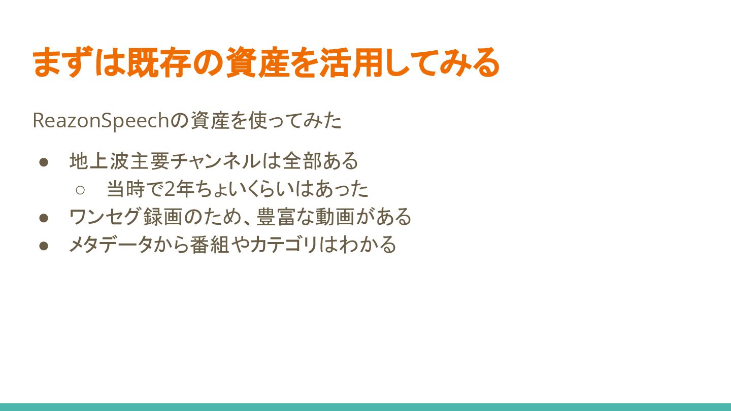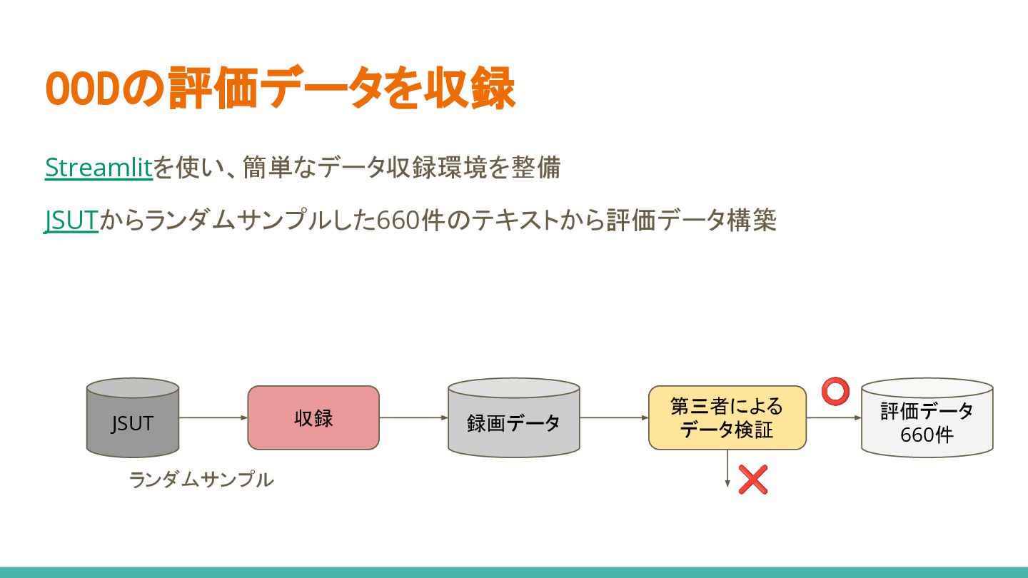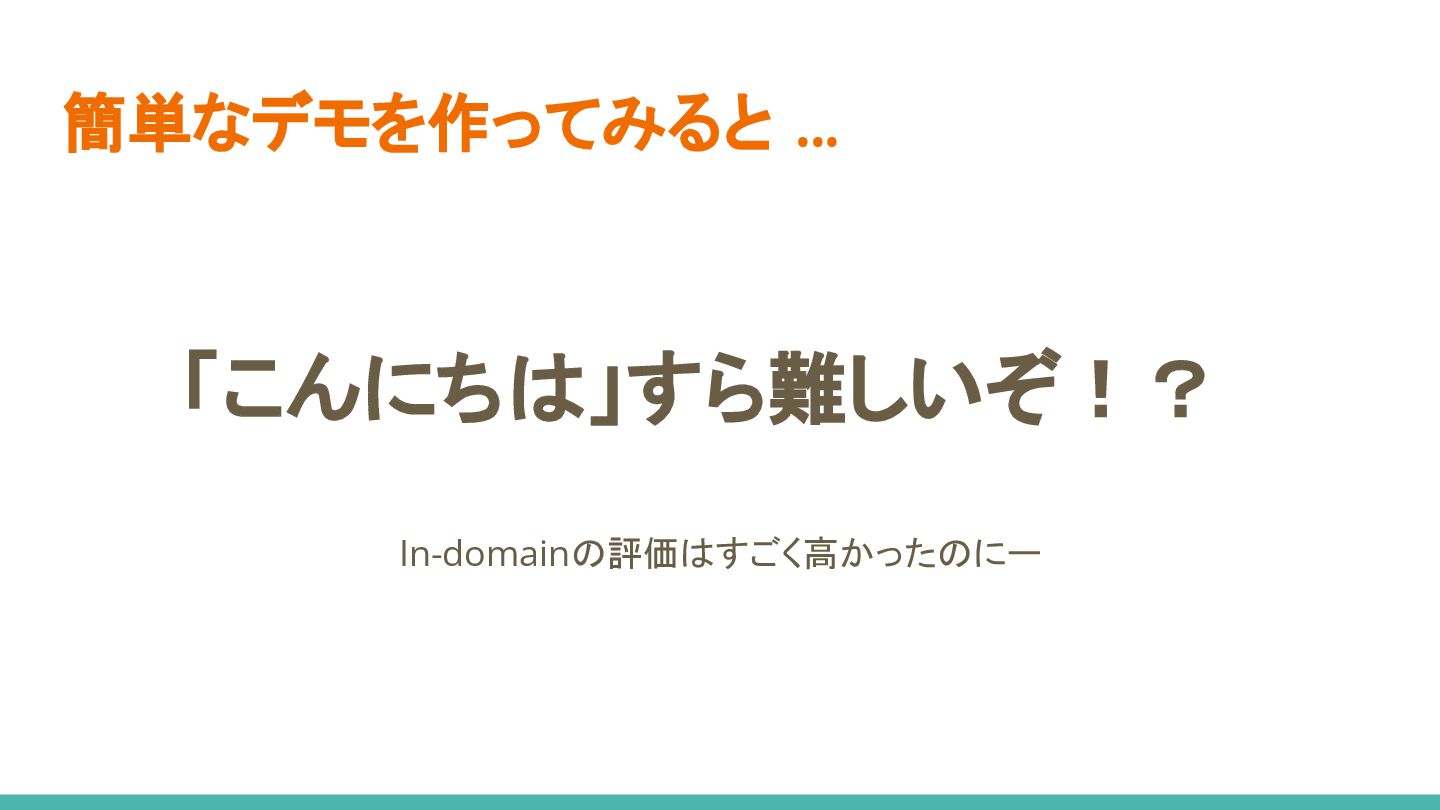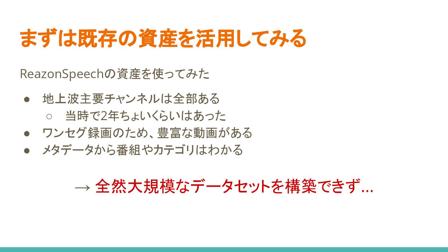 4. デモしたら全く使い物にならない... 評価データ作るかー 5. データスケール、 想像以上に難しすぎる...🤯 6. モデル実装時の判断が功を奏し、 お手軽リリースに成功✌ 1. データセット構築 2. モデル選定&実装 3. モデル学習 4. モデル評価 5. データスケールアップ 6. リリース
