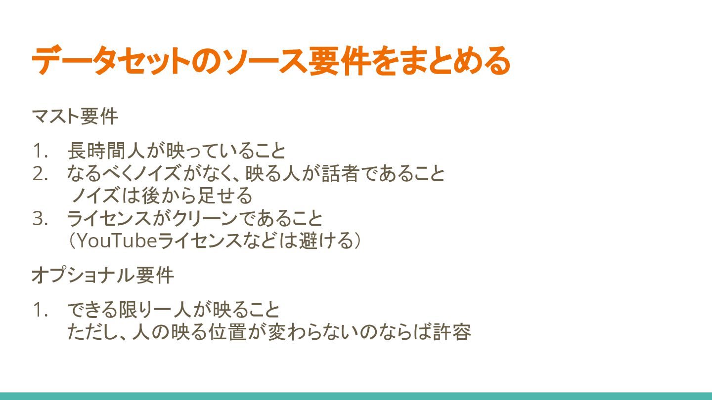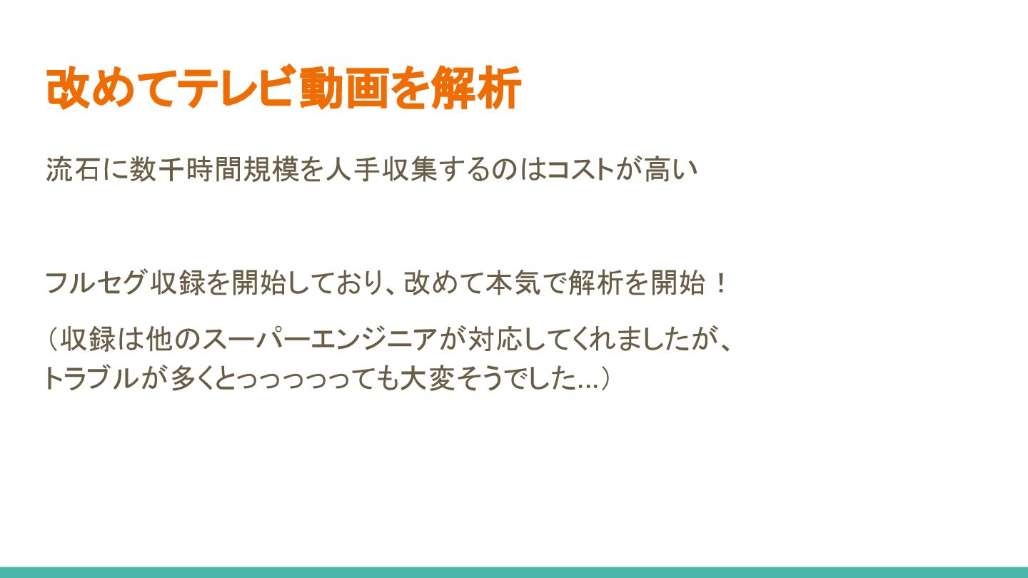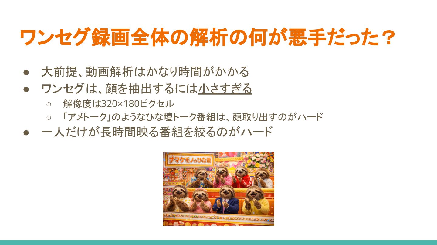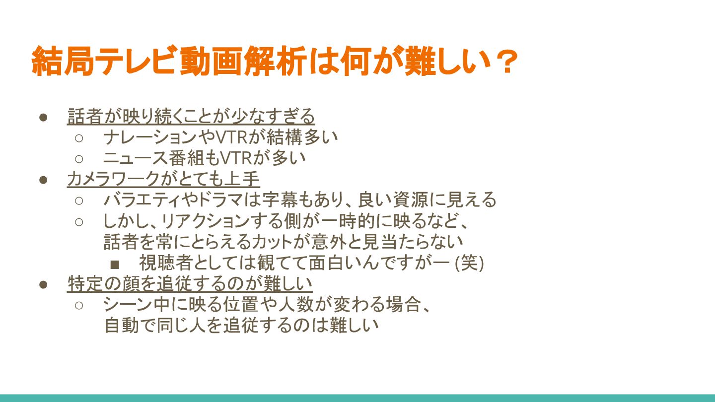バラエティやドラマは字幕もあり、良い資源に見える ◦ しかし、リアクションする側が一時的に映るなど、 話者を常にとらえるカットが意外と見当たらない ▪ 視聴者としては観てて面白いんですがー (笑) • 特定の顔を追従するのが難しい ◦ シーン中に映る位置や人数が変わる場合、 自動で同じ人を追従するのは難しい
