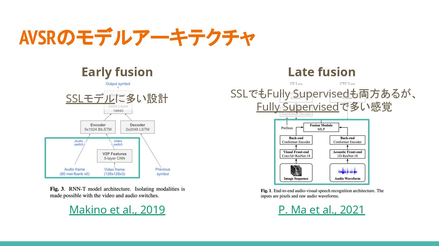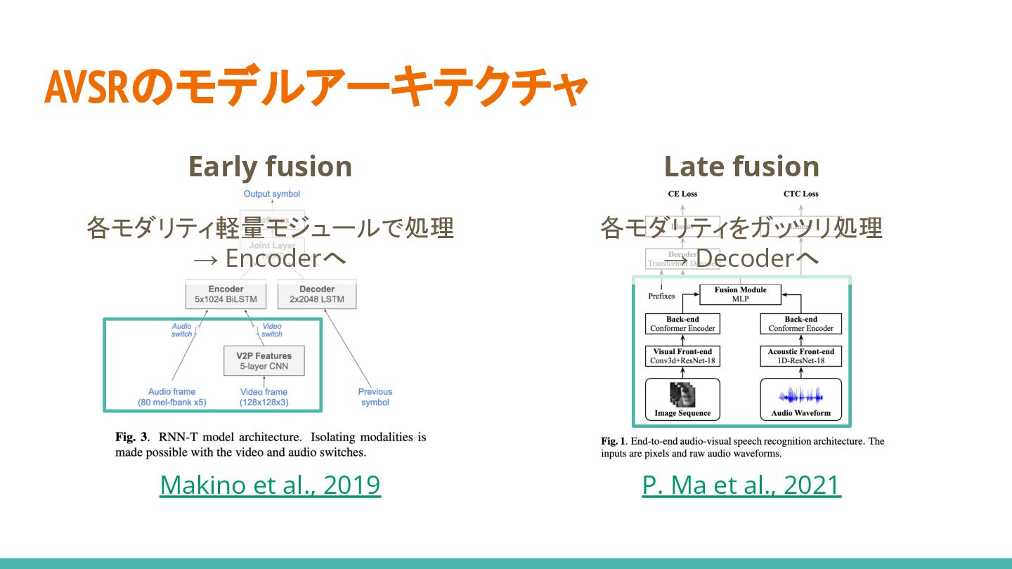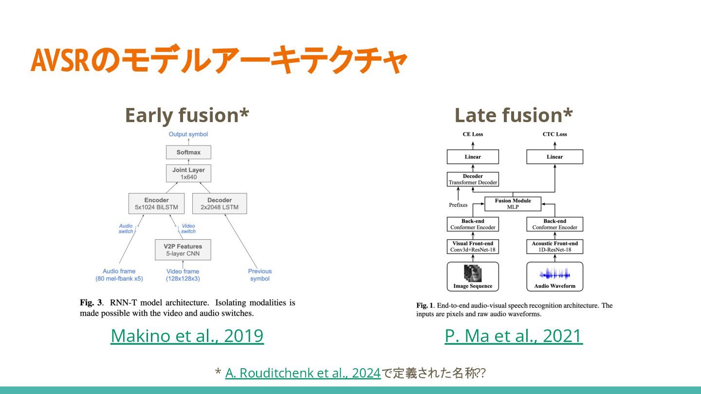 3. AVSRのモデルアーキテクチャ Early fusion* Late fusion* Makino et al., 2019 P.