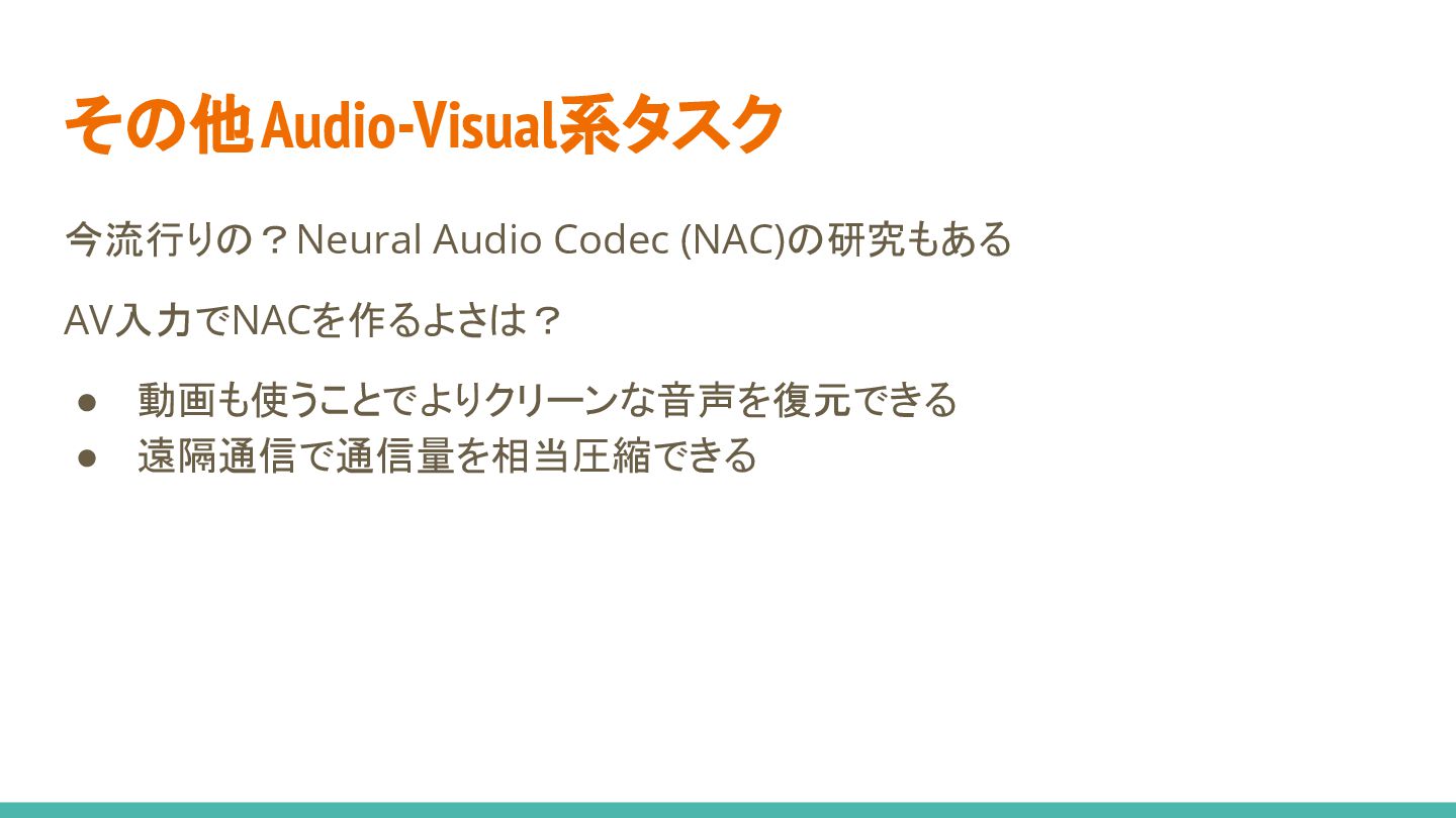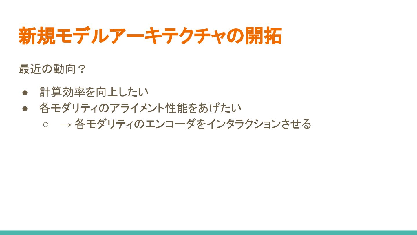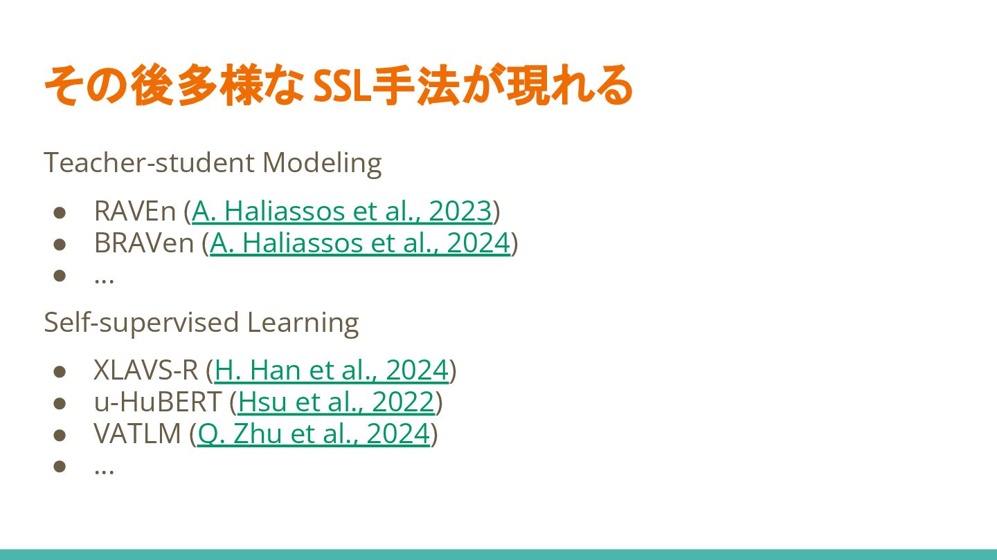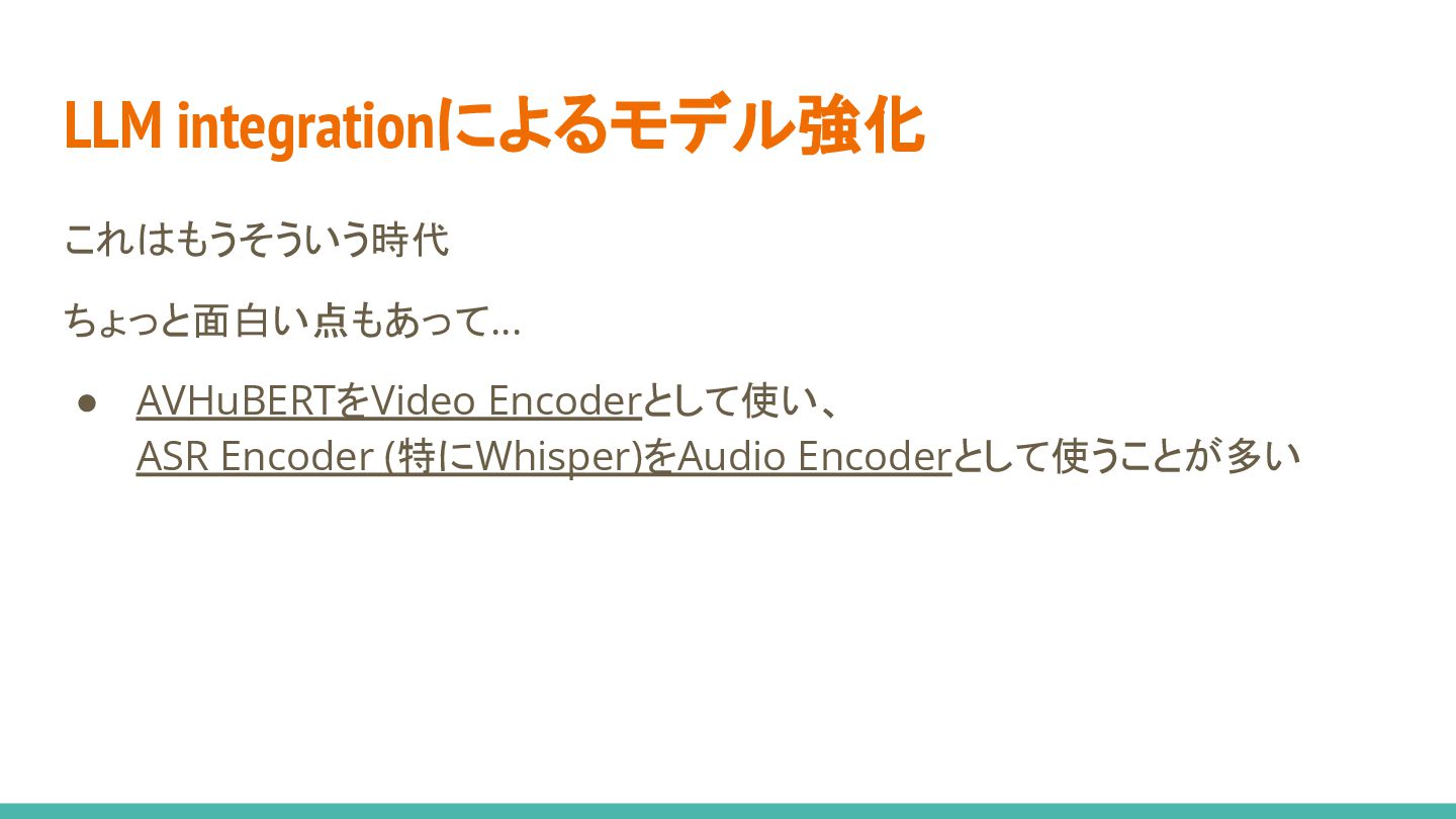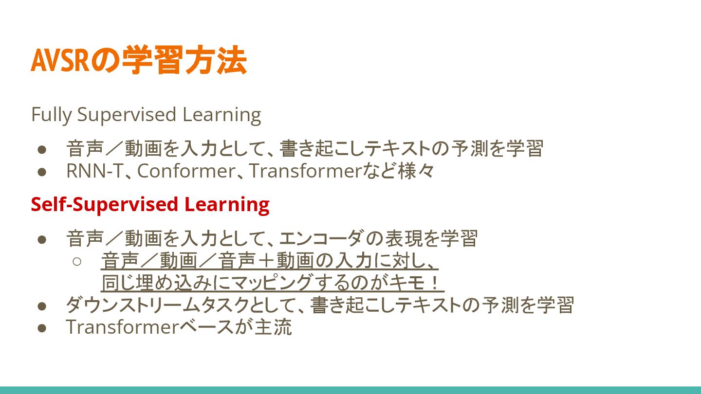 • 音声/動画を入力として、エンコーダの表現を学習 ◦ 音声/動画/音声+動画の入力に対し、 同じ埋め込みにマッピングするのがキモ! • ダウンストリームタスクとして、書き起こしテキストの予測を学習 • Transformerベースが主流