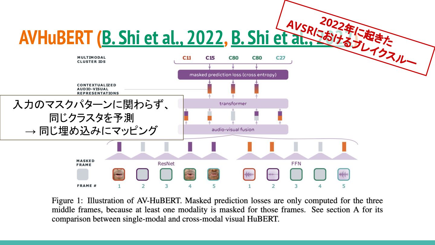 2022) 2022年に起きた AVSRにおけるブレイクスルー 入力のマスクパターンに関わらず、 同じクラスタを予測 → 同じ埋め込みにマッピング