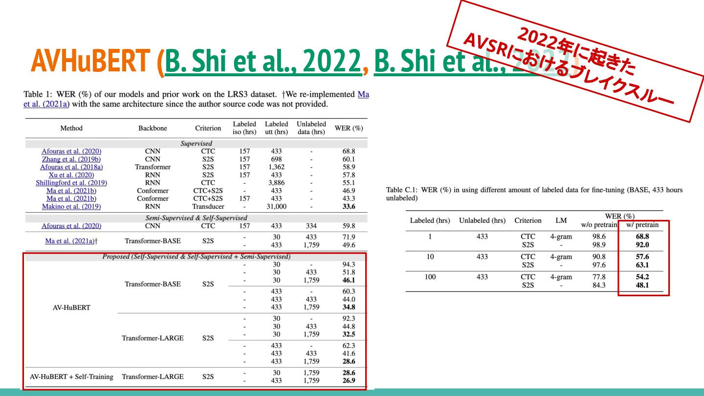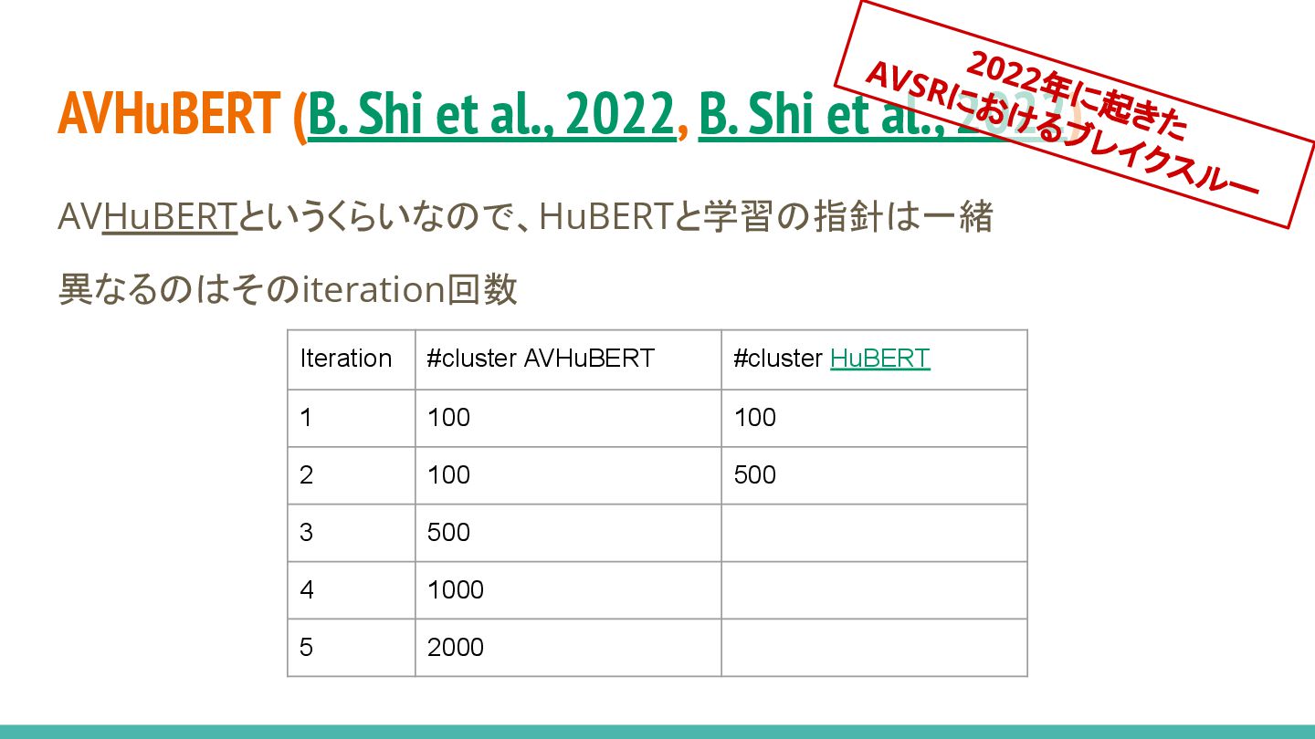 2022) AVHuBERTというくらいなので、HuBERTと学習の指針は一緒 異なるのはそのiteration回数 2022年に起きた AVSRにおけるブレイクスルー Iteration #cluster AVHuBERT #cluster HuBERT 1 100 100 2 100 500 3 500 4 1000 5 2000