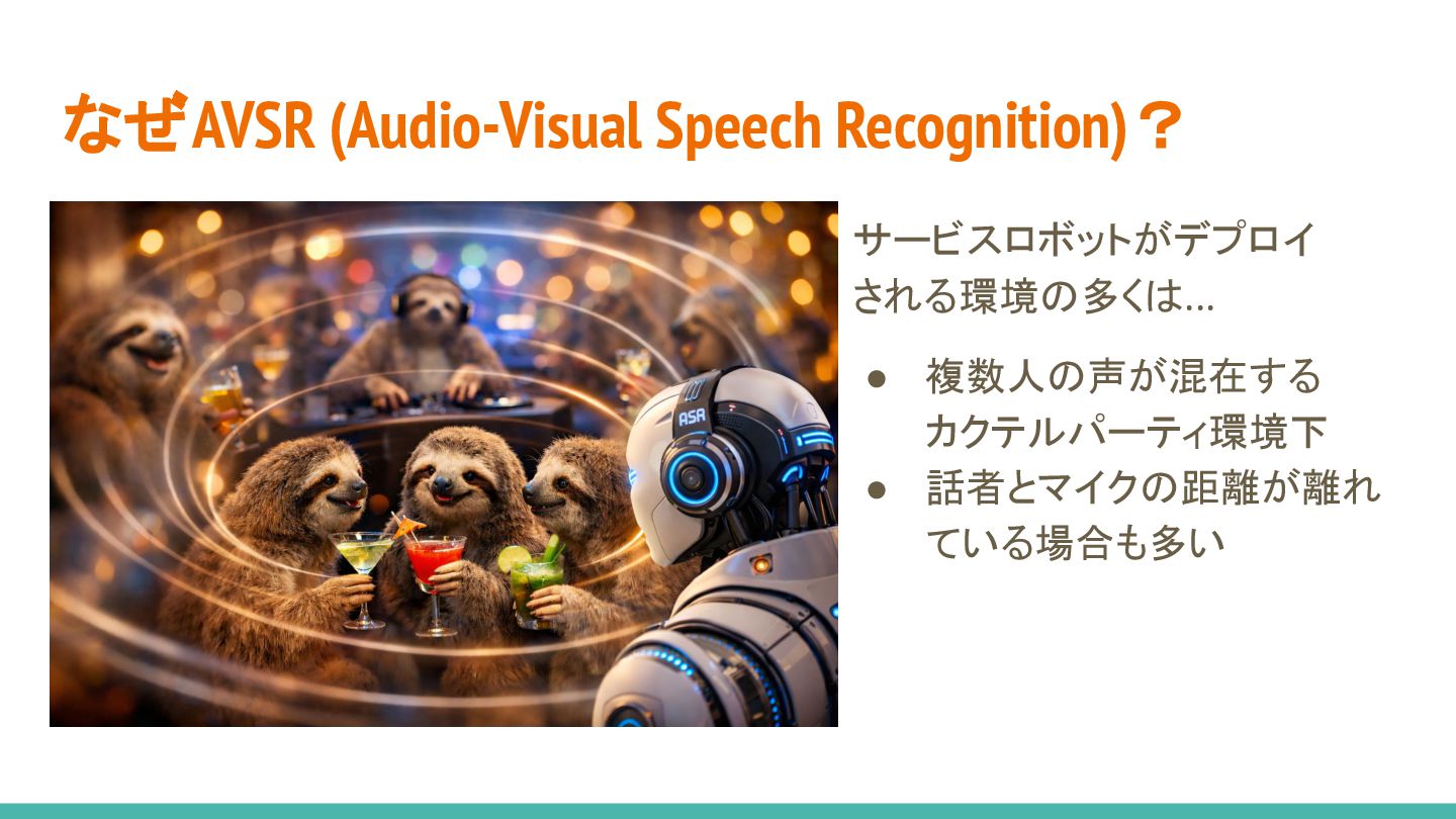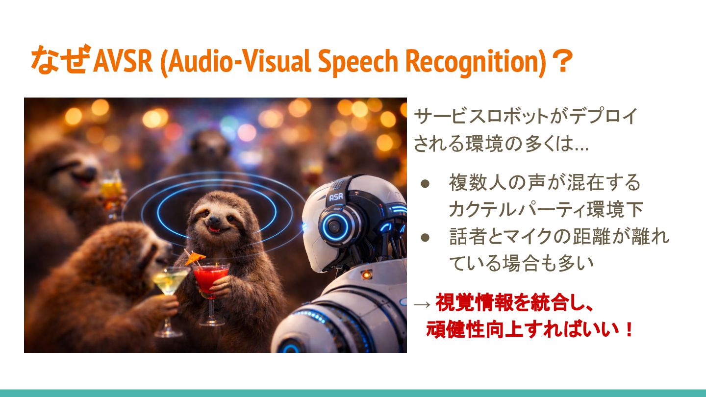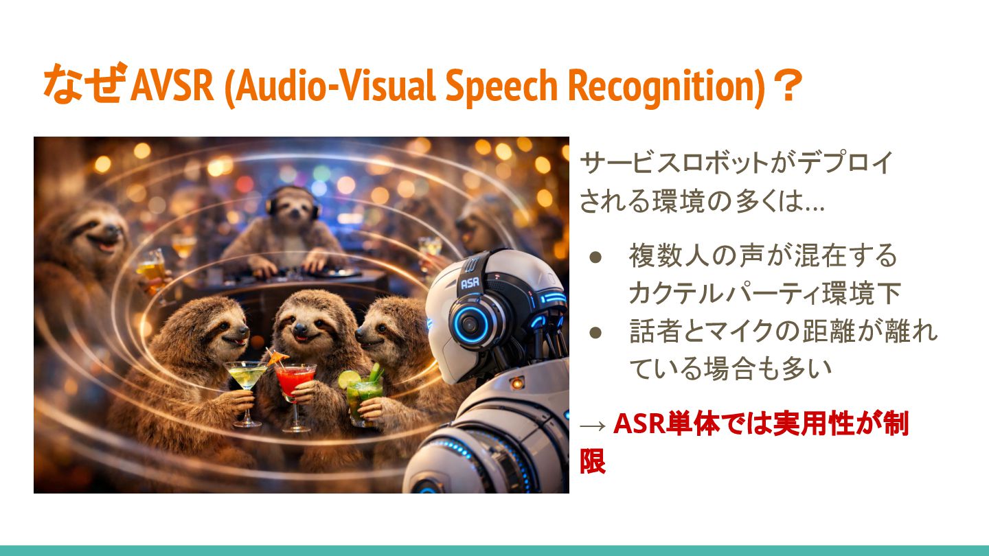 2. なぜAVSR (Audio-Visual Speech Recognition)? サービスロボットがデプロイ される環境の多くは... • 複数人の声が混在する カクテルパーティ環境下 •
