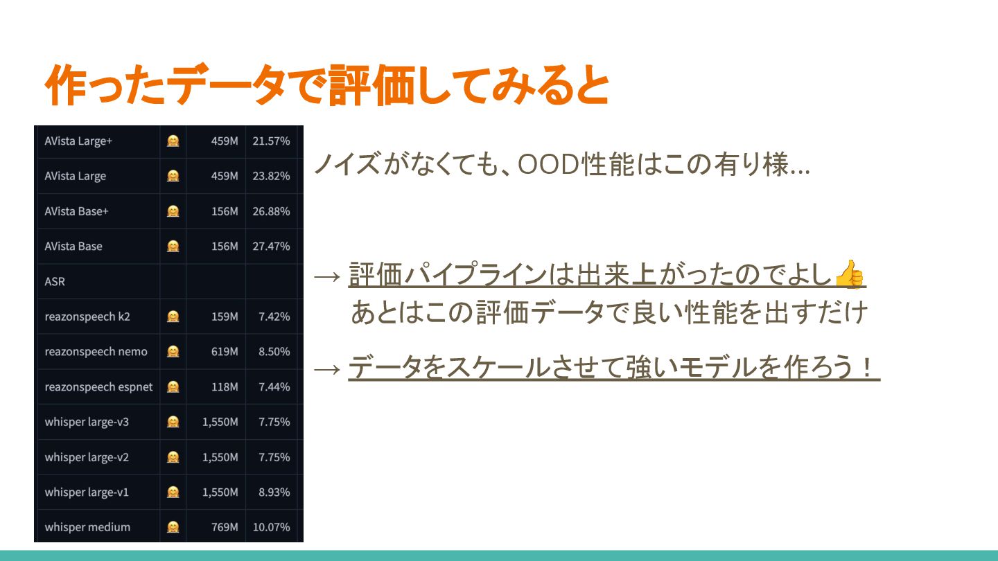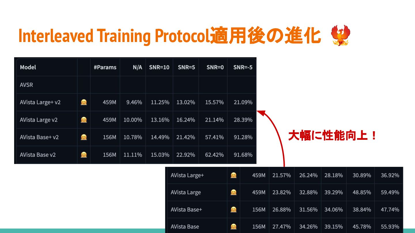 低資源なAVデータセットを両方使う 2. ミニバッチ作成時、Audio/AVのどちらか一方 のプールからデータをサンプリング 3. ノイズ耐性は多少犠牲にしつつ、 基本性能を底上げ