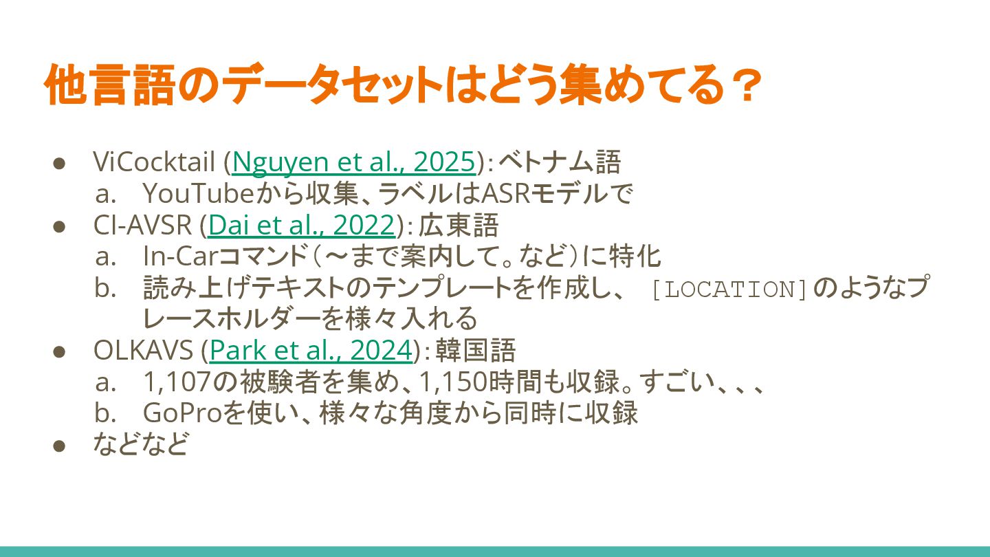 CI-AVSR (Dai et al., 2022):広東語 a. In-Carコマンド(〜まで案内して。など)に特化 b. 読み上げテキストのテンプレートを作成し、 [LOCATION]のようなプ レースホルダーを様々入れる • OLKAVS (Park et al., 2024):韓国語 a. 1,107の被験者を集め、1,150時間も収録。すごい、、、 b. GoProを使い、様々な角度から同時に収録 • などなど