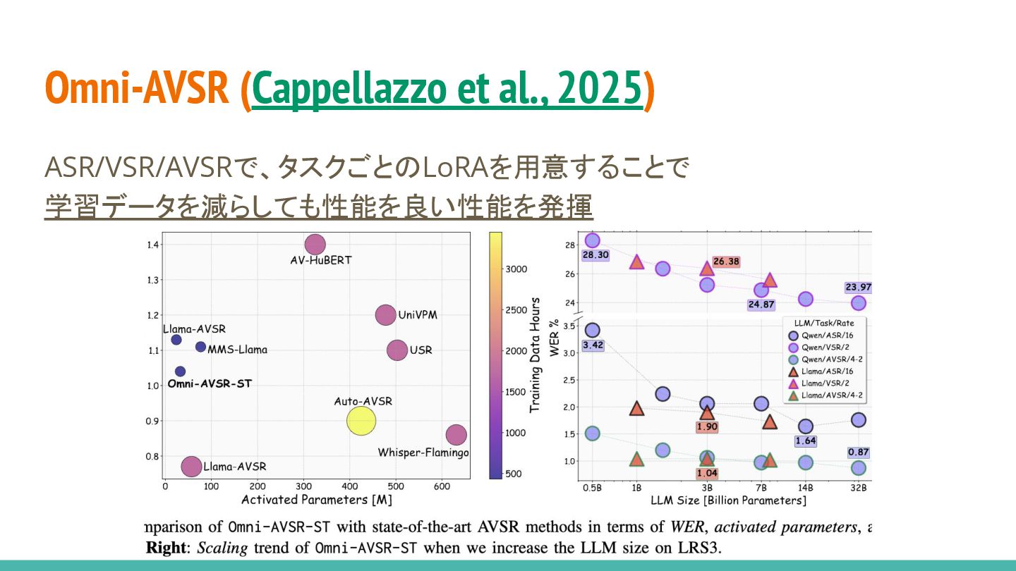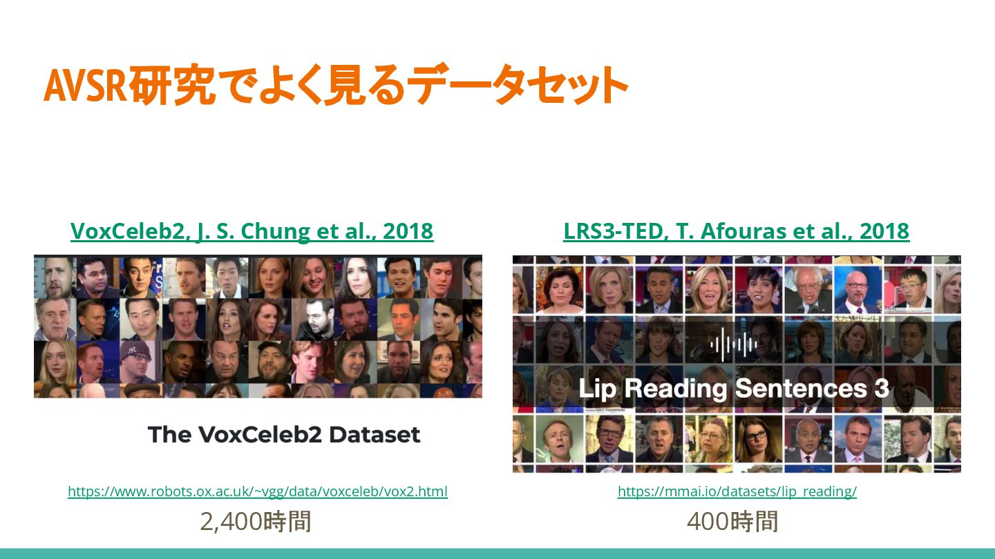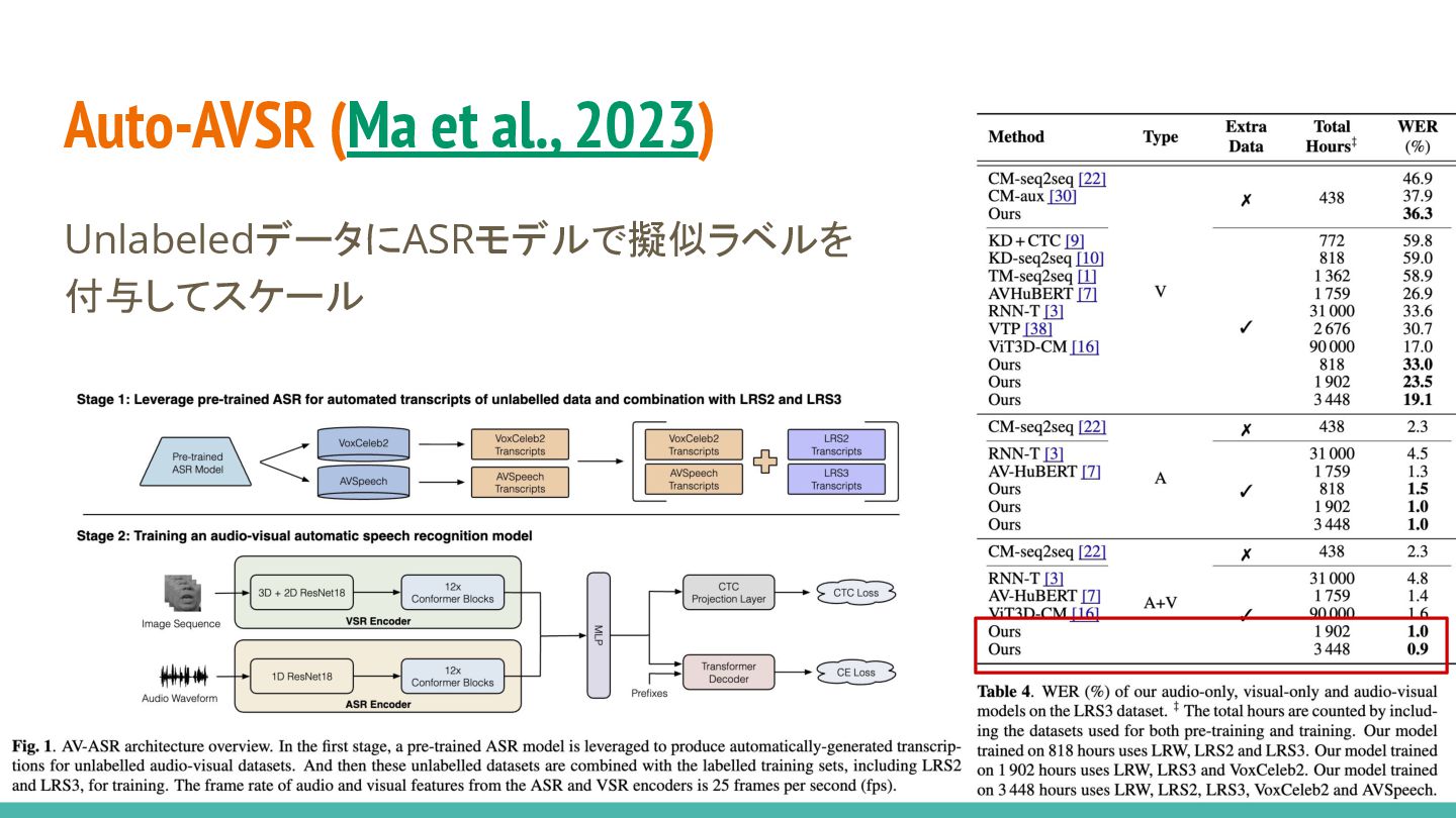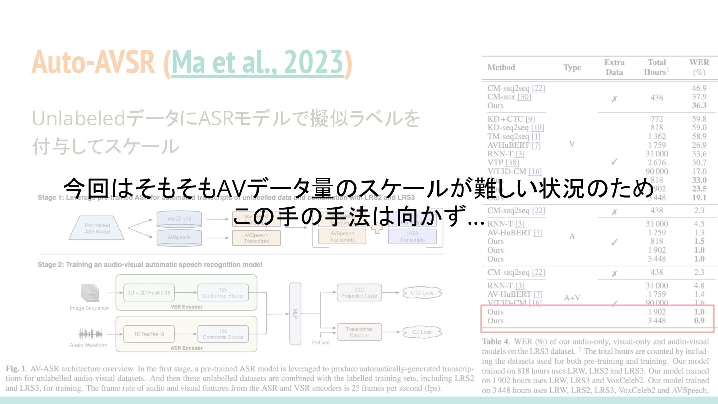 al., 2023) • LRS3のテストデータは0.9hのみ • In-the-wildなテストデータを作ると VSRの性能がかなり落ちたよーとの レポート