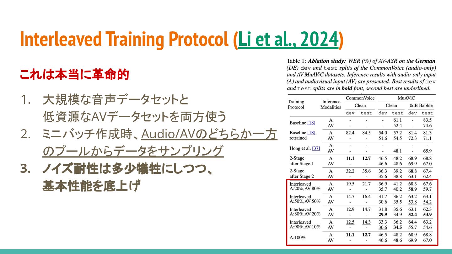 14. Interleaved Training Protocol (Li et al., 2024) これは本当に革命的 1. 大規模な音声データセットと