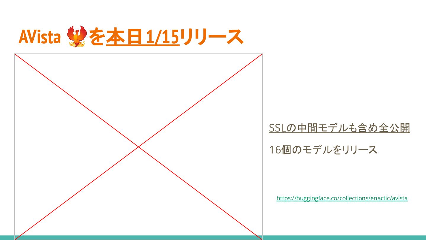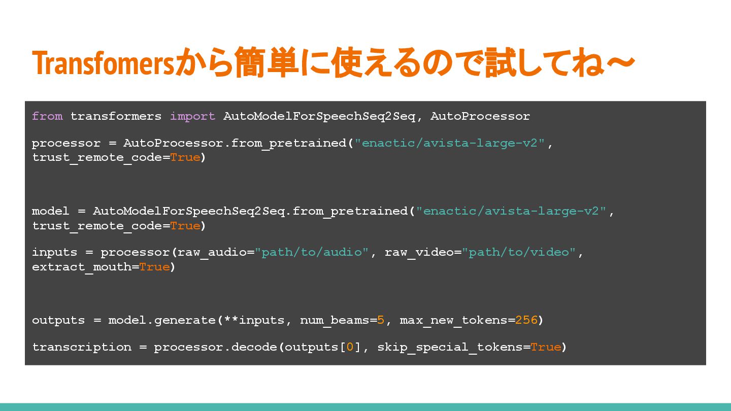 15. Transfomersから簡単に使えるので試してね〜 from transformers import AutoModelForSpeechSeq2Seq, AutoProcessor processor = AutoProcessor.from_pretrained("enactic/avista-large-v2", trust_remote_code=True)