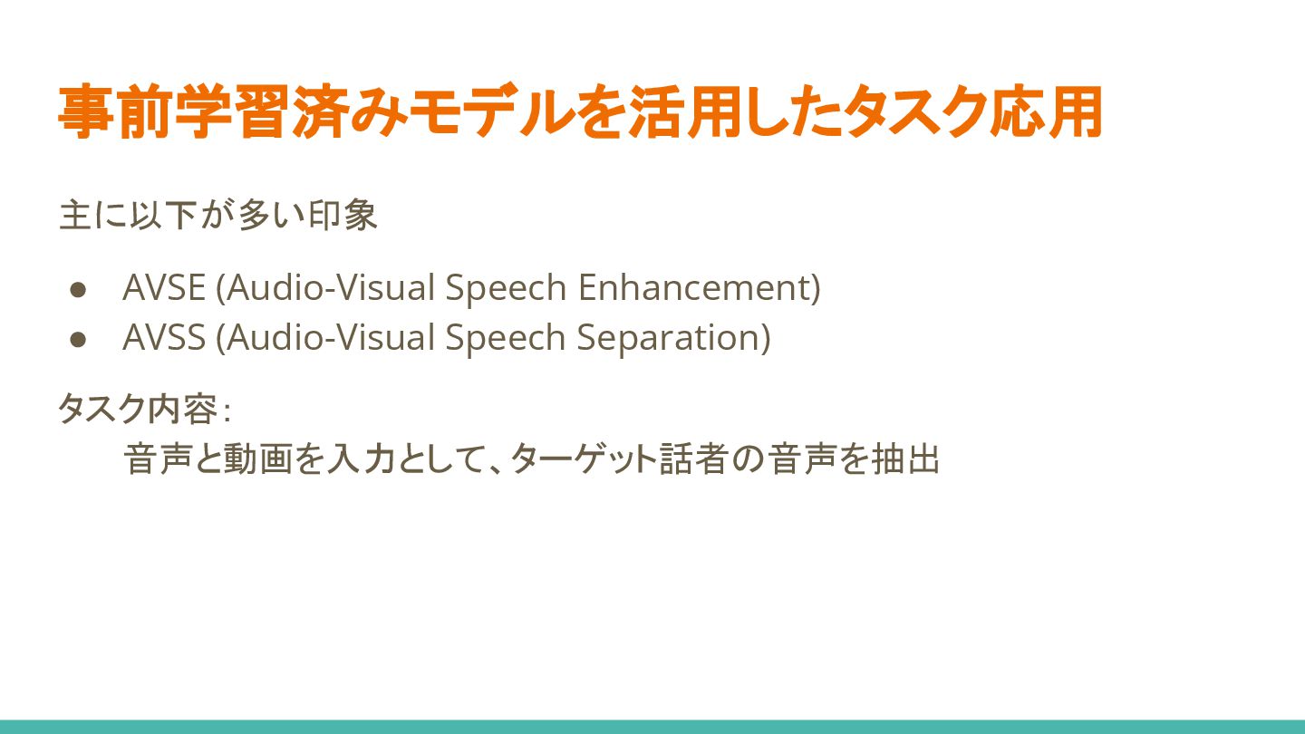 16. 事前学習済みモデルを活用したタスク応用 主に以下が多い印象 • AVSE (Audio-Visual Speech Enhancement) • AVSS (Audio-Visual