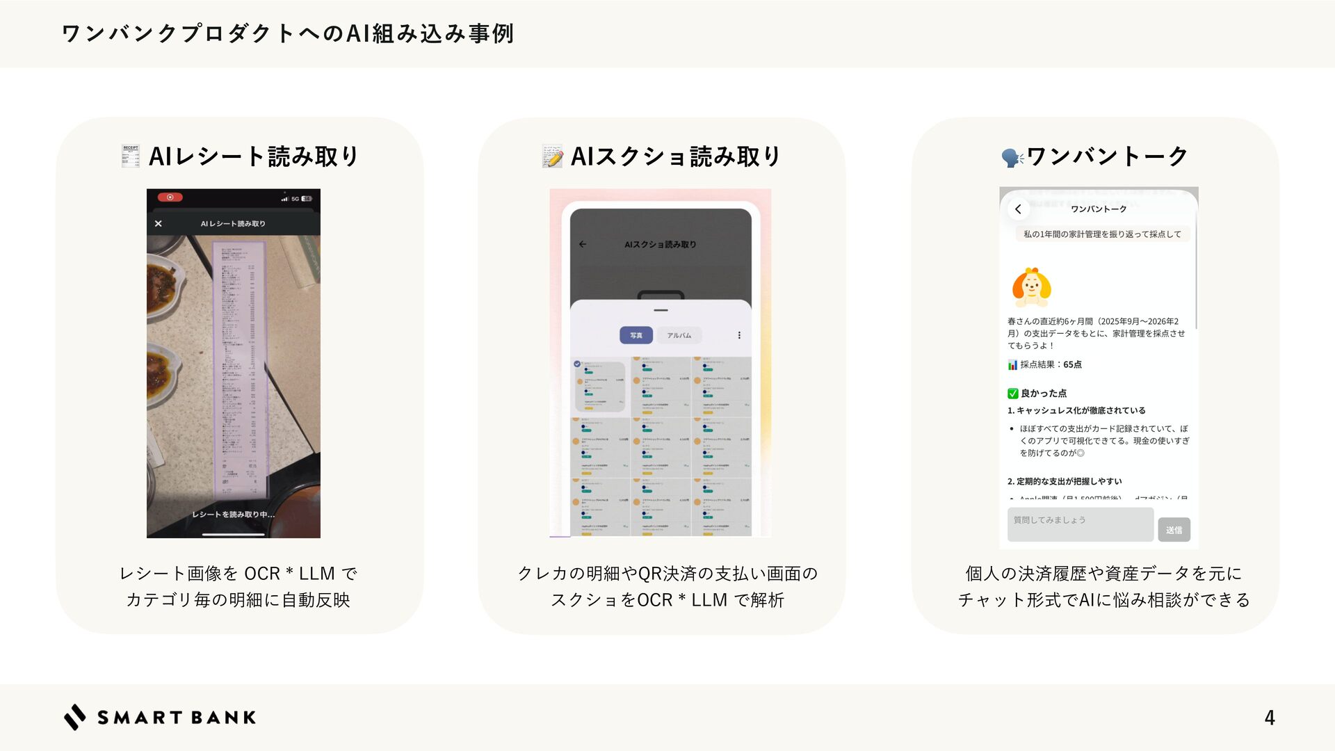 ϫϯόϯΫϓϩμΫτͷ"*ΈࠐΈࣄྫ 🧾"*ϨγʔτಡΈऔΓ Ϩγʔτը૾Λ0$3 --.Ͱ ΧςΰϦຖͷ໌ࡉʹࣗಈө 🗣ϫϯόϯτʔΫ ݸਓͷܾࡁཤྺࢿ࢈σʔλΛݩʹ νϟοτܗࣜͰ"*ʹΈ૬ஊ͕Ͱ͖Δ 📝"*εΫγϣಡΈऔΓ
