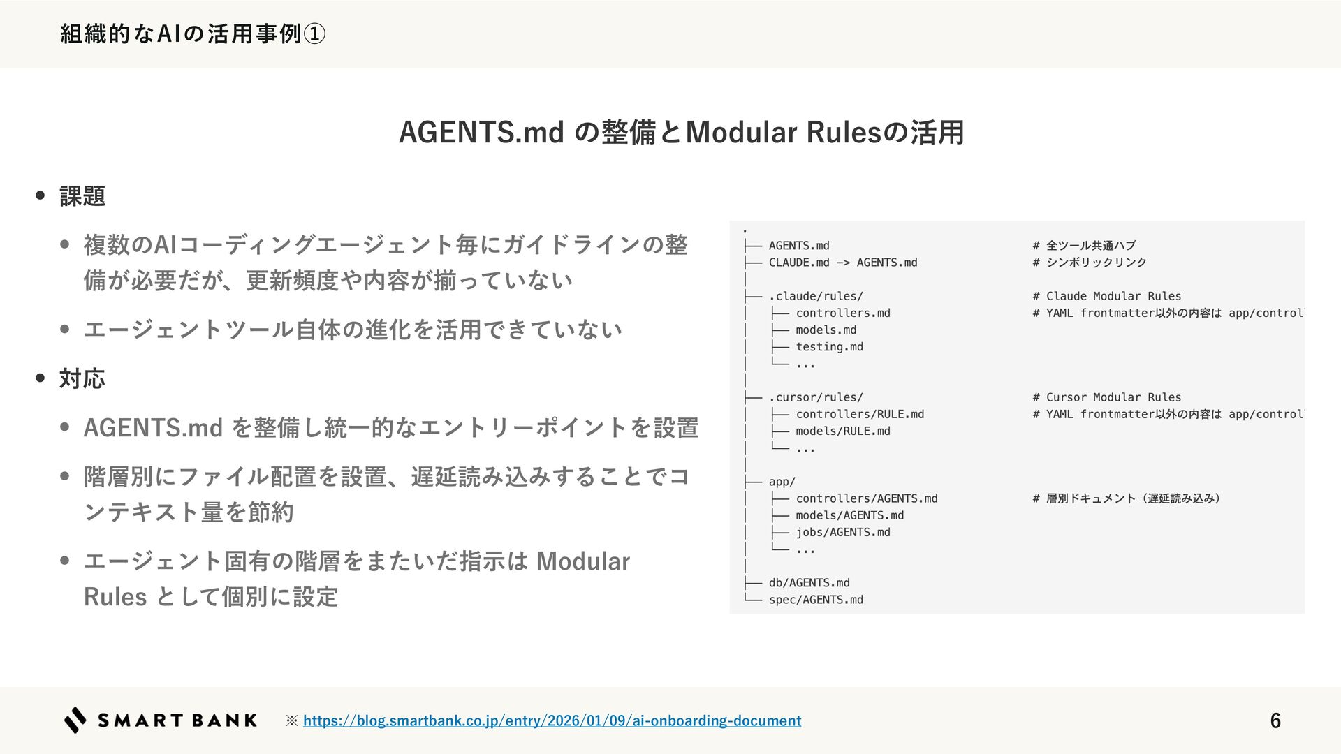 ৫తͳ"*ͷ׆༻ࣄྫᶃ "(&/54NEͷඋͱ.PEVMBS3VMFTͷ׆༻ ˞IUUQTCMPHTNBSUCBOLDPKQFOUSZBJPOCPBSEJOHEPDVNFOU w ՝ w ෳͷ"*ίʔσΟϯάΤʔδΣϯτຖʹΨΠυϥΠϯͷ උ͕ඞཁ͕ͩɺߋ৽ස༰͕ἧ͍ͬͯͳ͍ w