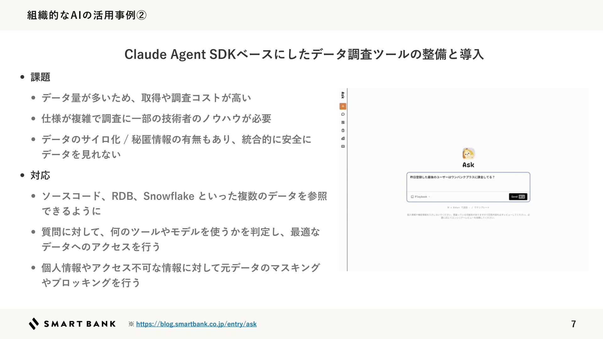 ৫తͳ"*ͷ׆༻ࣄྫᶄ $MBVEF"HFOU4%,ϕʔεʹͨ͠σʔλௐࠪπʔϧͷඋͱಋೖ ˞IUUQTCMPHTNBSUCBOLDPKQFOUSZBTL w ՝ w σʔλྔ͕ଟ͍ͨΊɺऔಘௐࠪίετ͕ߴ͍ w ༷͕ෳࡶͰௐࠪʹҰ෦ͷٕज़ऀͷϊϋ͕ඞཁ