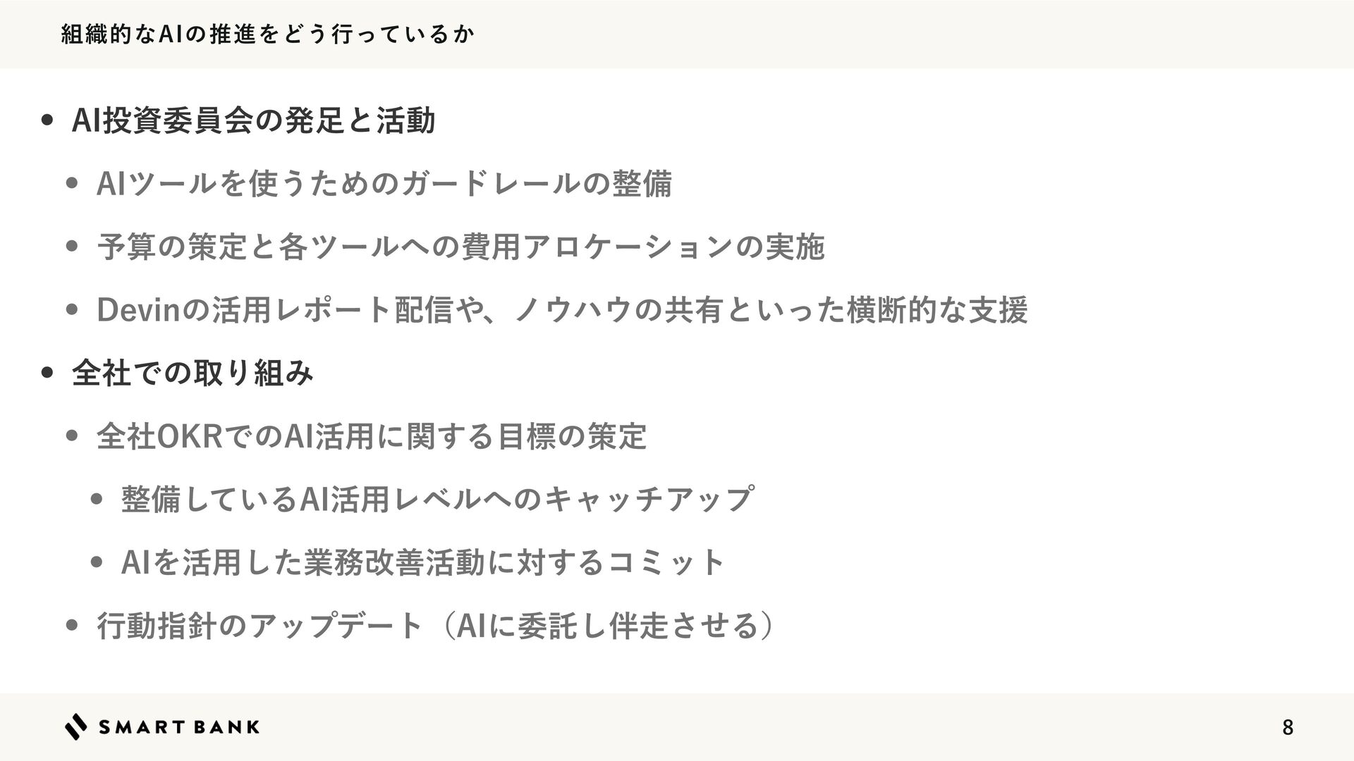 ৫తͳ"*ͷਪਐΛͲ͏ߦ͍ͬͯΔ͔ w "*ࢿҕһձͷൃͱ׆ಈ w "*πʔϧΛ͏ͨΊͷΨʔυϨʔϧͷඋ w ༧ࢉͷࡦఆͱ֤πʔϧͷඅ༻Ξϩέʔγϣϯͷ࣮ࢪ w %FWJOͷ׆༻Ϩϙʔτ৴ɺϊϋͷڞ༗ͱ͍ͬͨԣஅతͳࢧԉ