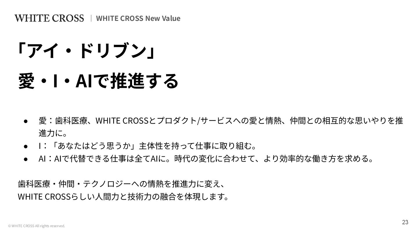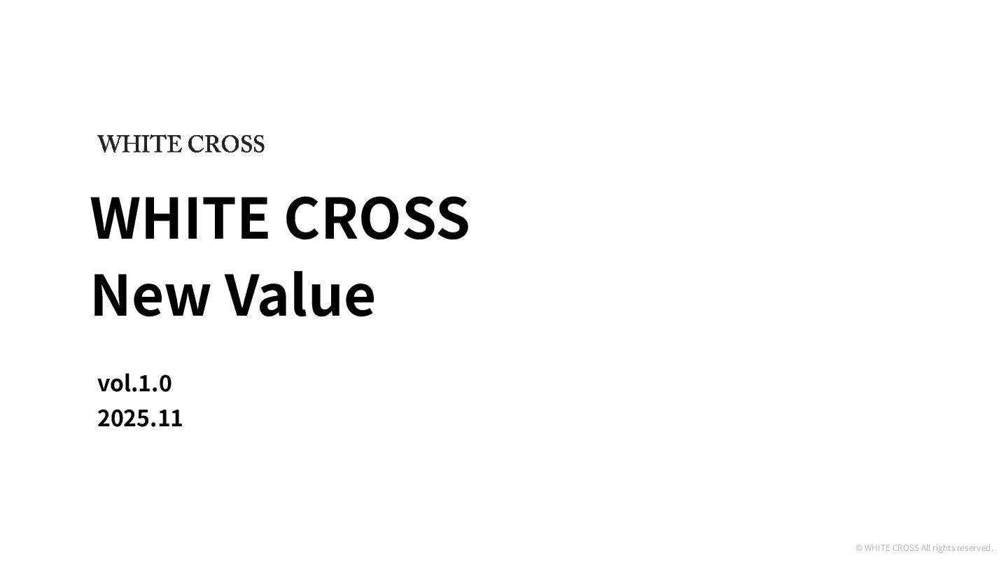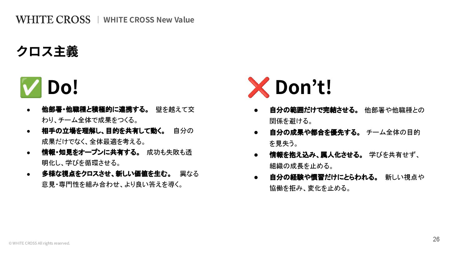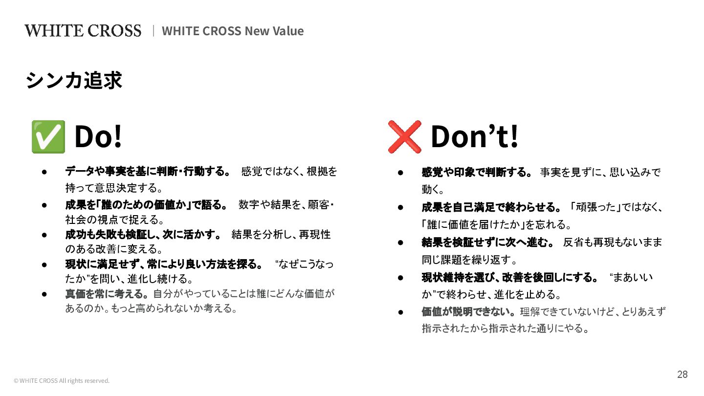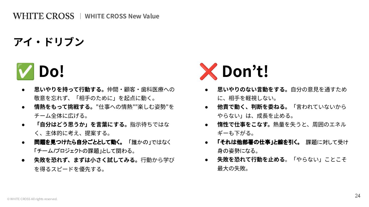 「⾃分はどう思うか」を⾔葉にする。指⽰待ちではな く、主体的に考え、提案する。 • 問題を見つけたら自分ごととして動く。 「誰かの」ではなく 「チーム/プロジェクトの課題」として関わる。 • 失敗を恐れず、まずは⼩さく試してみる。⾏動から学び を得るスピードを優先する。 ❌ Don’t! • 思いやりのない⾔動をする。⾃分の意⾒を通すため に、相⼿を軽視しない。 • 他責で動く、判断を委ねる。「⾔われていないから やらない」は、成⻑を⽌める。 • 惰性で仕事をこなす。熱量を失うと、周囲のエネル ギーも下がる。 • 「それは他部署の仕事」と線を引く。 課題に対して受け 身の姿勢になる。 • 失敗を恐れて⾏動を⽌める。「やらない」ことこそ 最⼤の失敗。 © WHITE CROSS All rights reserved. | WHITE CROSS New Value アイ‧ドリブン