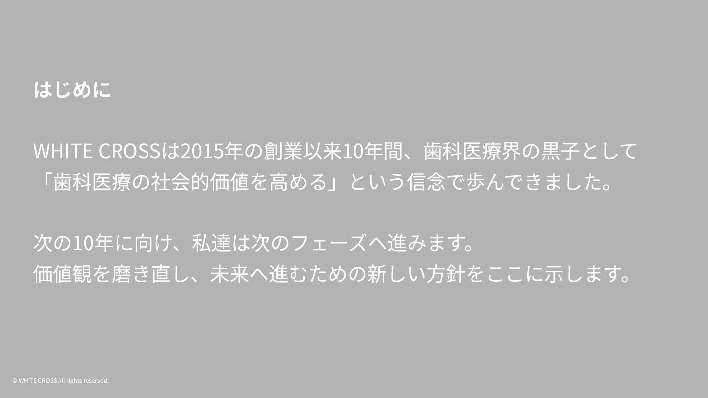 1. © WHITE CROSS All rights reserved. はじめに WHITE CROSSは2015年の創業以来10年間、⻭科医療界の黒⼦として 「⻭科医療の社会的価値を⾼める」という信念で歩んできました。
