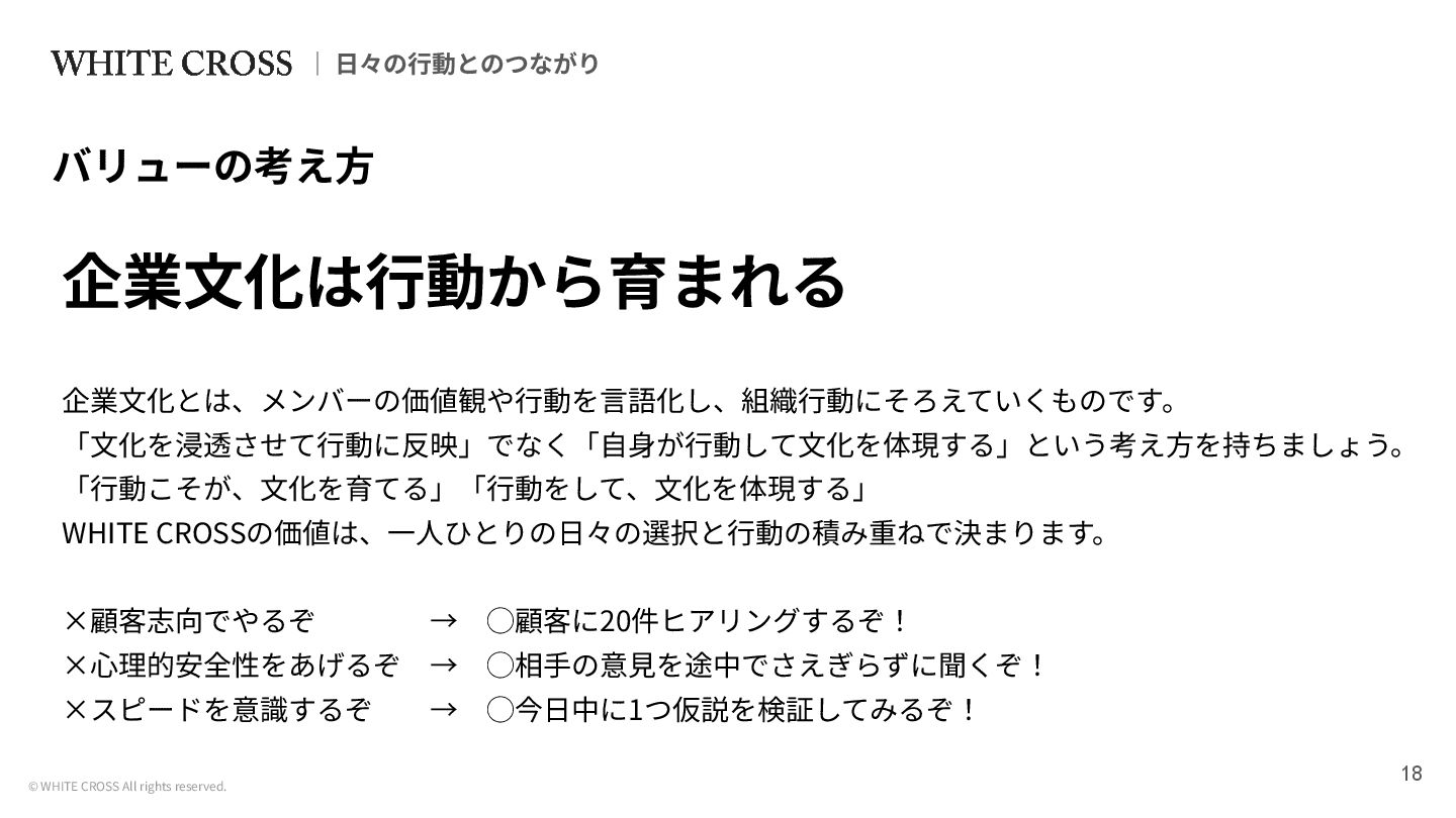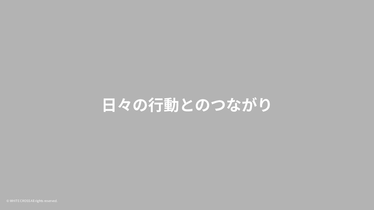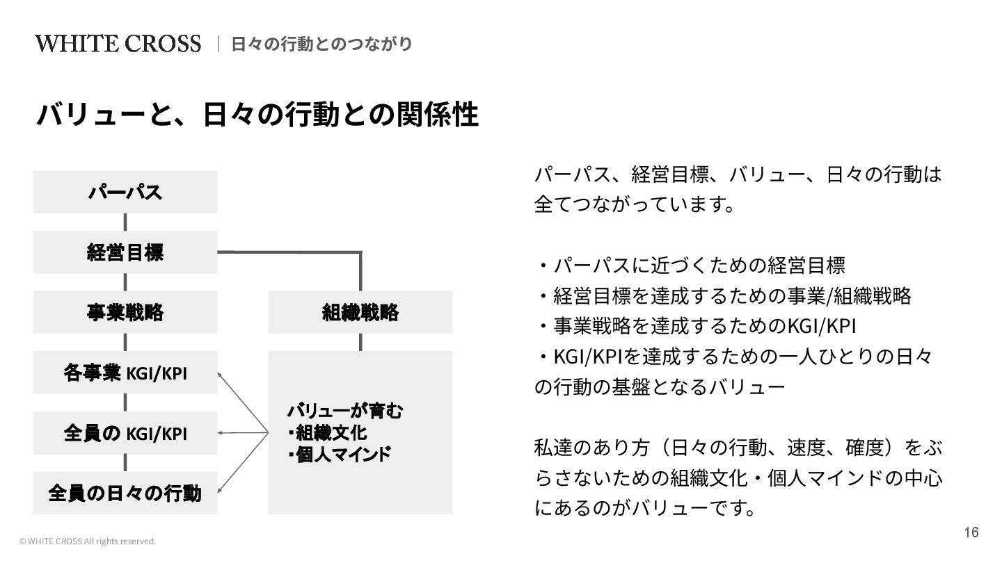 にあるのがバリューです。 パーパス 経営目標 事業戦略 組織戦略 各事業 KGI/KPI 全員の KGI/KPI 全員の日々の行動  バリューが育む  ・組織文化  ・個人マインド © WHITE CROSS All rights reserved. | ⽇々の⾏動とのつながり バリューと、⽇々の⾏動との関係性