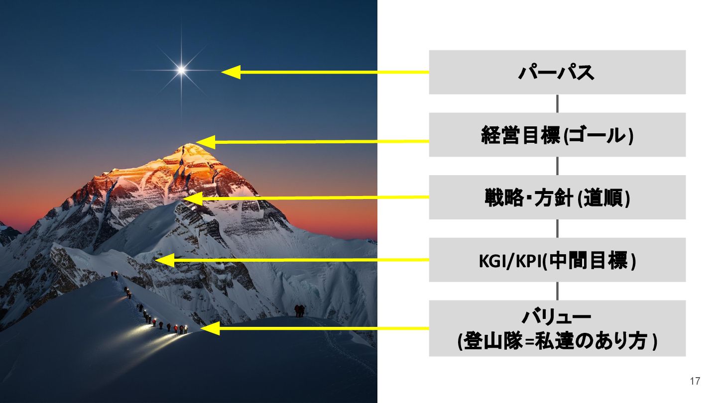 9. 16 パーパス、経営⽬標、バリュー、⽇々の⾏動は 全てつながっています。 ‧パーパスに近づくための経営⽬標 ‧経営⽬標を達成するための事業/組織戦略 ‧事業戦略を達成するためのKGI/KPI ‧KGI/KPIを達成するための⼀⼈ひとりの⽇々 の⾏動の基盤となるバリュー 私達のあり⽅(⽇々の⾏動、速度、確度)をぶ らさないための組織⽂化‧個⼈マインドの中⼼